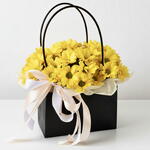 A bright and uplifting bouquet of 11 yellow chrysanthemums arranged in a sleek black bag. The bold contrast adds a modern, striking look—perfect for cheerful gifting, celebrations, and décor.