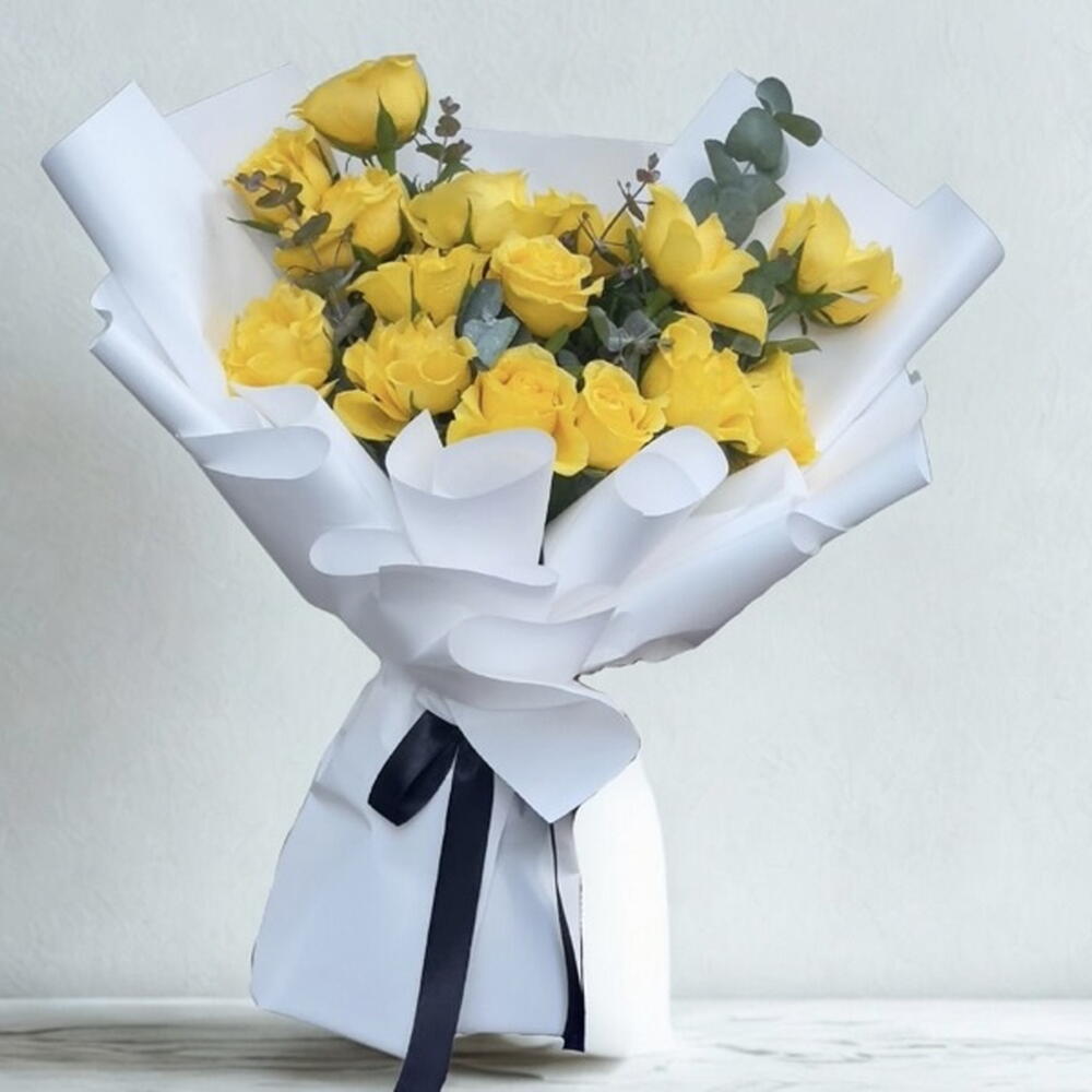 Ribbon - 1 pcs Ruscus - 5 pcs Yellow rose - 15 pcs white wrapping paper - 4 pcs
