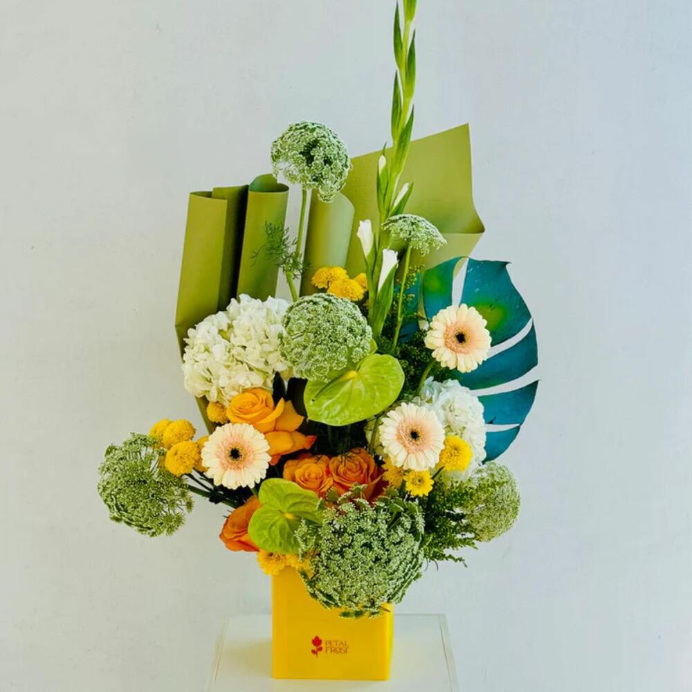 A cheerful and radiant arrangement that celebrates the joy of color and life. This stunning acrylic yellow box features 5 Ammi, 1 Gladiolus white, 4 orange roses, 2 white hydrangeas, 3 yellow Santinis, 5 Solidago, and 2 green Anthuriums, artfully arranged to bring warmth and happiness to any space. A perfect balance of bright tones and elegant textures that express optimism, appreciation, and success. ✨ Best for: Congratulations, success celebrations, birthdays, housewarmings, Flowwow UAE, cheerful gifts.