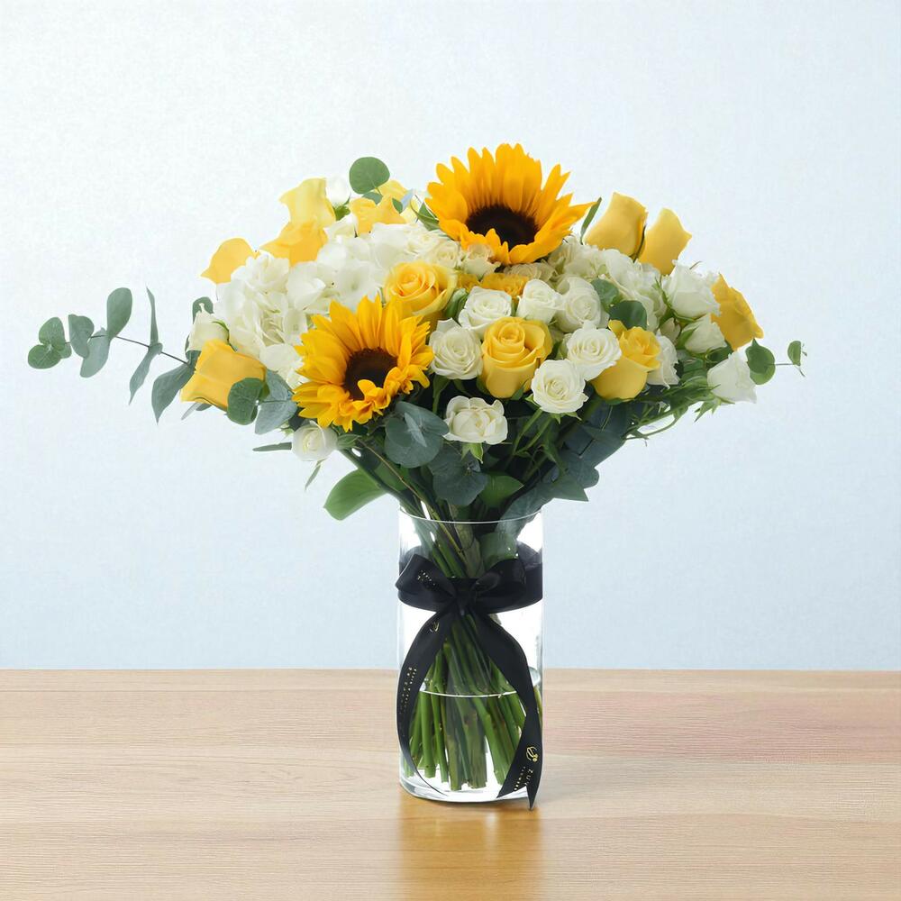 Eucalyptus - 3 pcs Ruscus - 6 pcs glass vase - 1 pcs white hydrangea - 2 pcs yellow sunflowers - 2 pcs white spray roses - 7 pcs yellow roses - 12 pcs