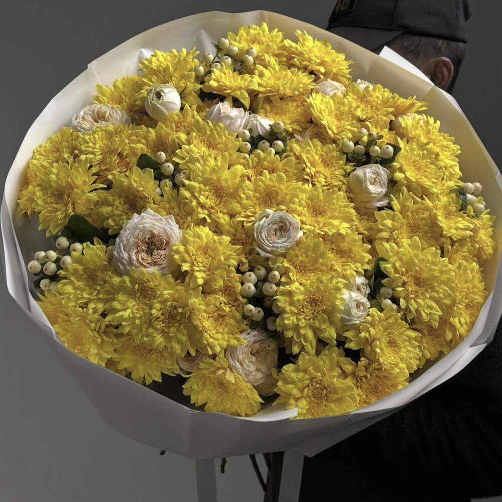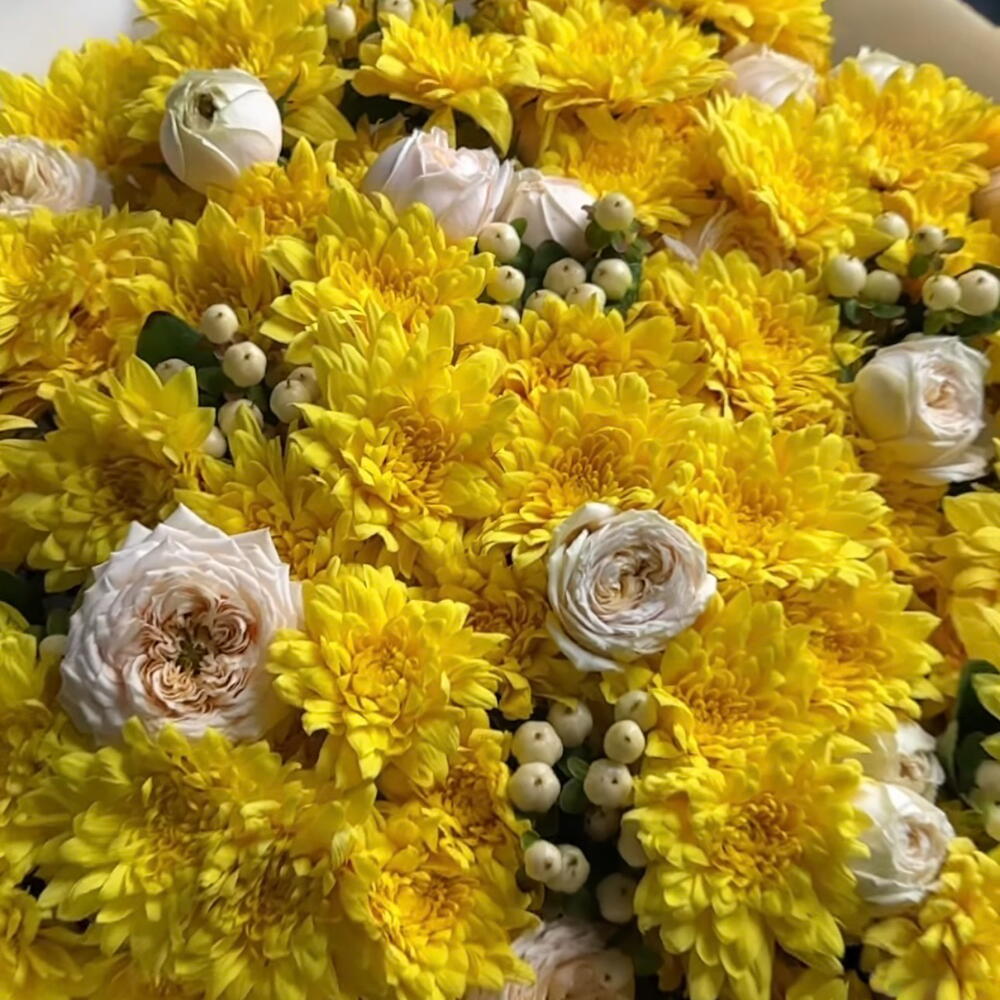 This stunning, oversized round bouquet is a burst of pure joy and warmth. It features a lush mix of vibrant bright yellow chrysanthemums (mums) as the main flower, creating a cheerful, sunny effect. Interspersed throughout are elegant ivory/white garden roses with soft, romantic layers, adding sophistication and delicate fragrance. Small clusters of white hypericum berries (St. John’s wort berries) are dotted among the blooms for texture and a fresh, playful touch, while lush green foliage peeks through for natural contrast. Wrapped in crisp white paper that enhances the clean, bright aesthetic, this mega bouquet is generously sized — perfect for making a bold statement on birthdays, anniversaries, congratulations, or simply to brighten someone’s day.