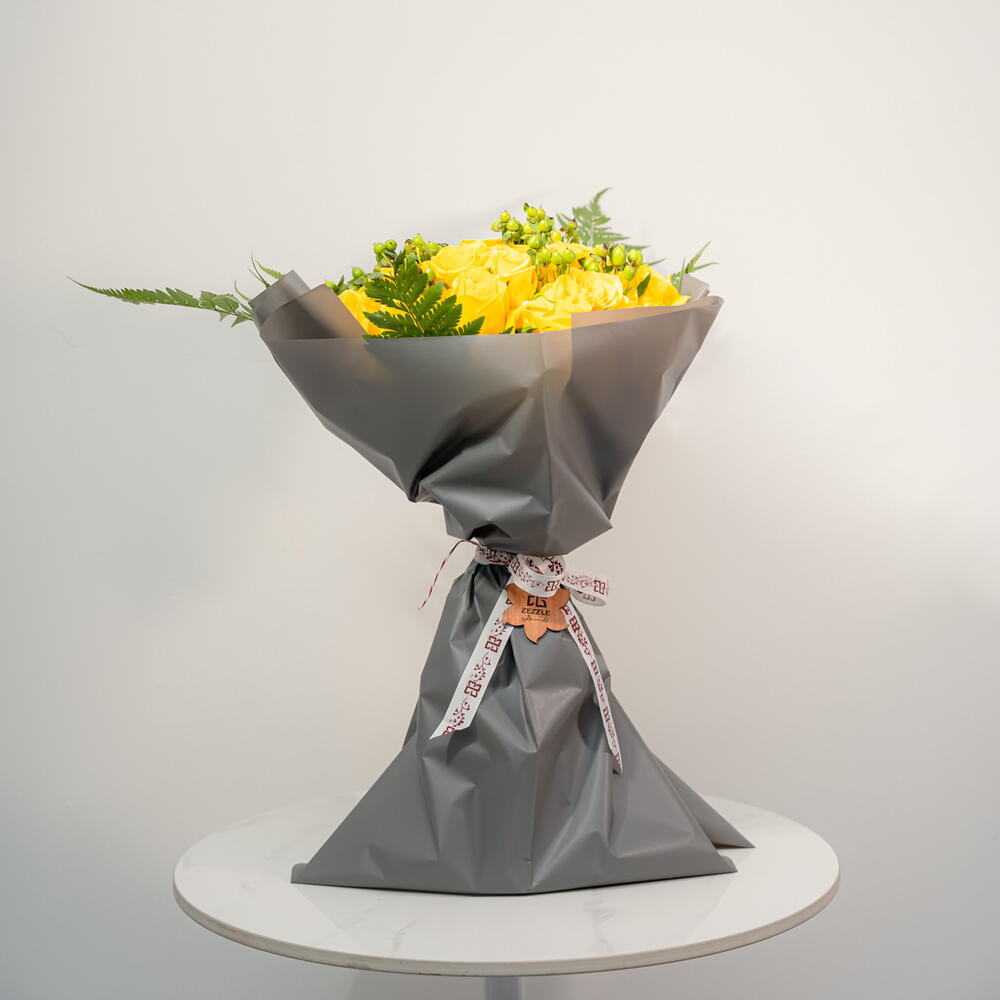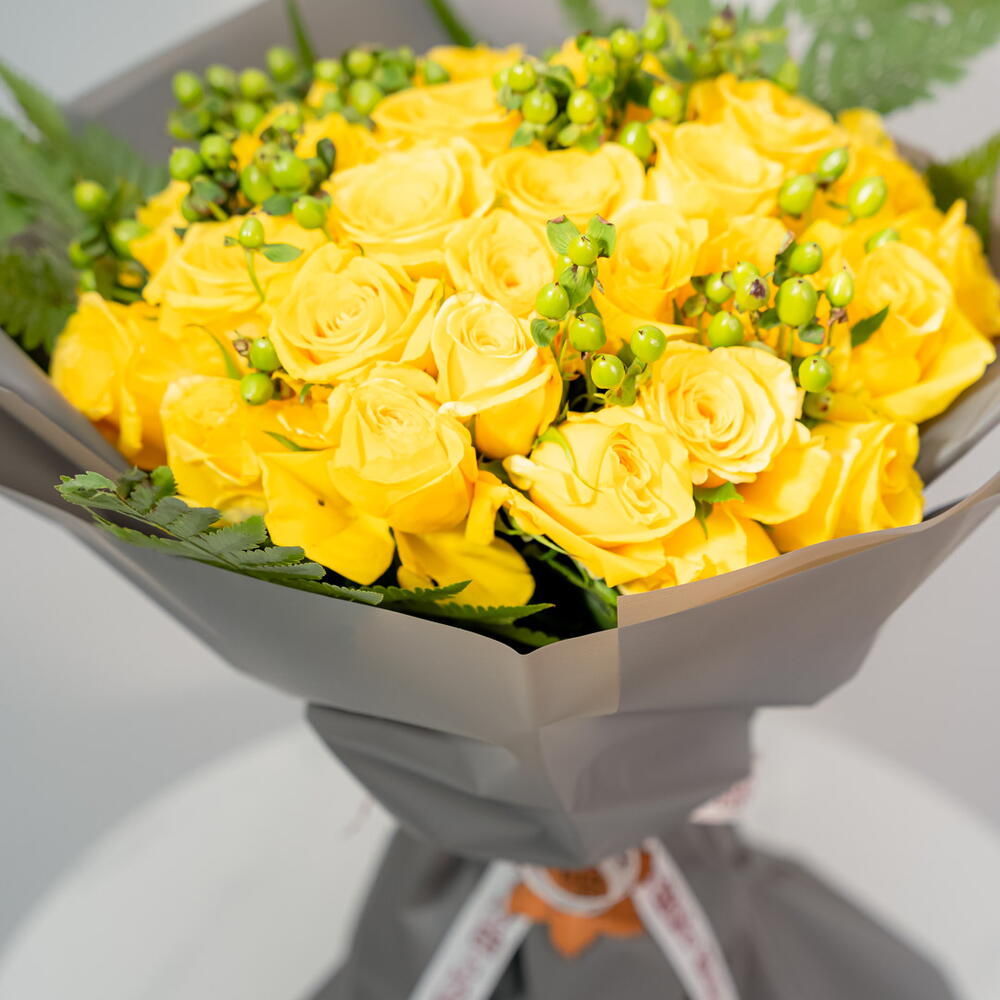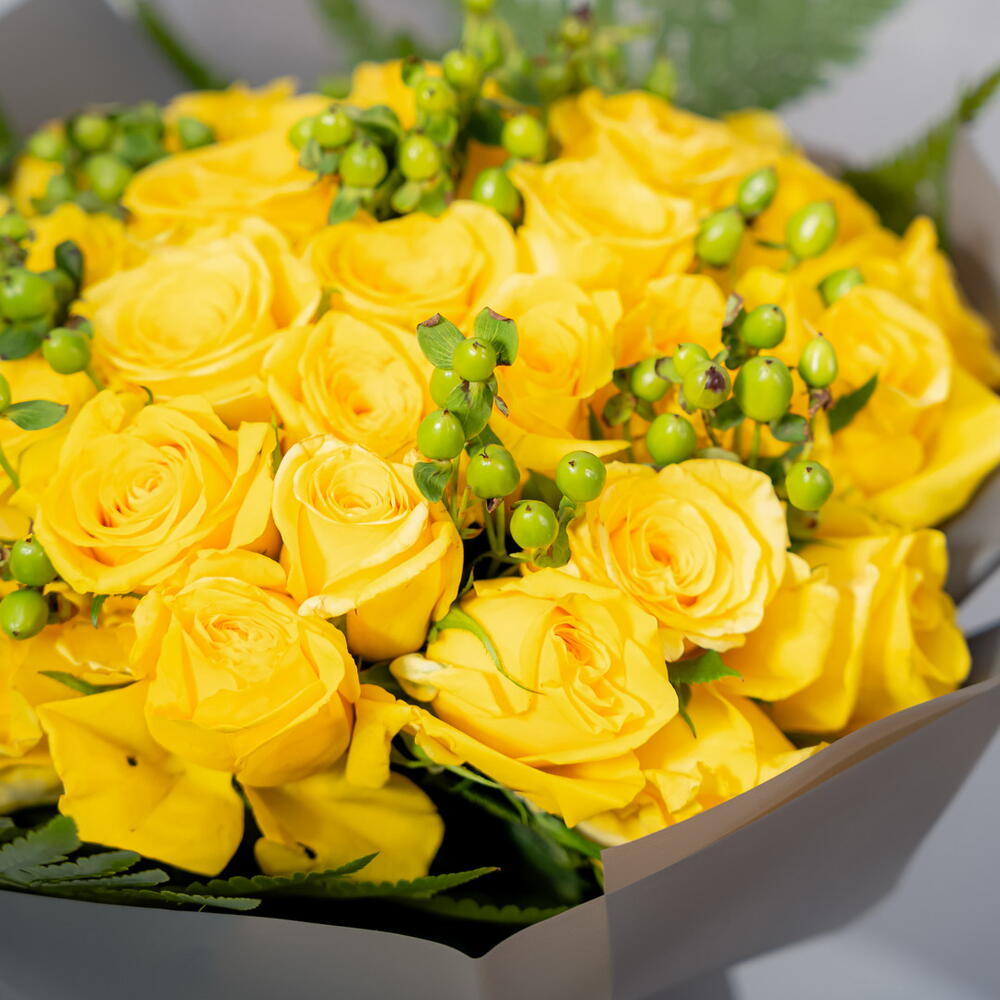 A cheerful and vibrant bouquet, the Sunshine Serenade features 30 sunny yellow roses, 6 bright green hypericum berries, and 4 lush leather fern leaves. This vibrant arrangement is perfect for expressing joy, friendship, and happiness. The bright yellow roses, combined with the contrasting green foliage, create a cheerful and uplifting display.