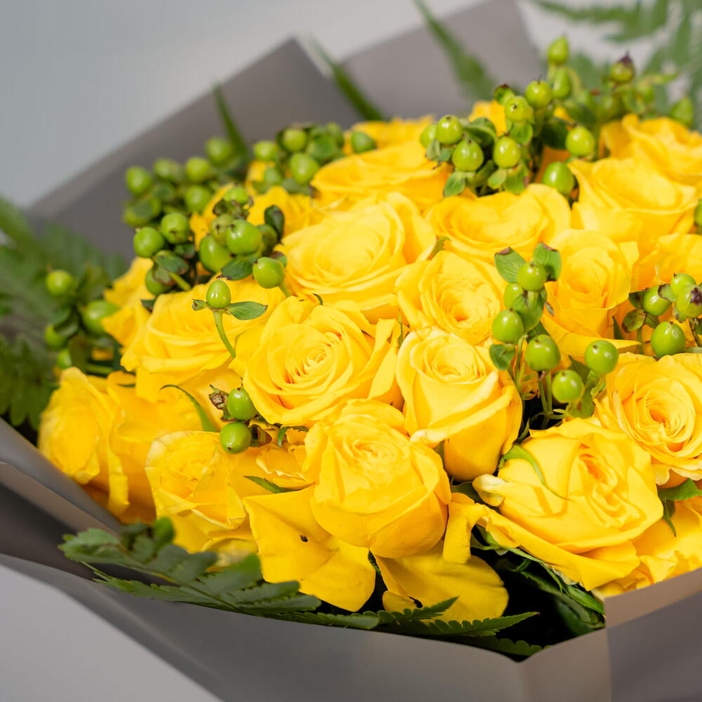 rose yellow - 30 pcs leather fern - 4 pcs hypericum green - 10 pcs