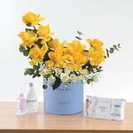 Eucalyptus - 5 pcs baby’s breath - 5 pcs white spray roses - 6 pcs yellow roses - 10 pcs