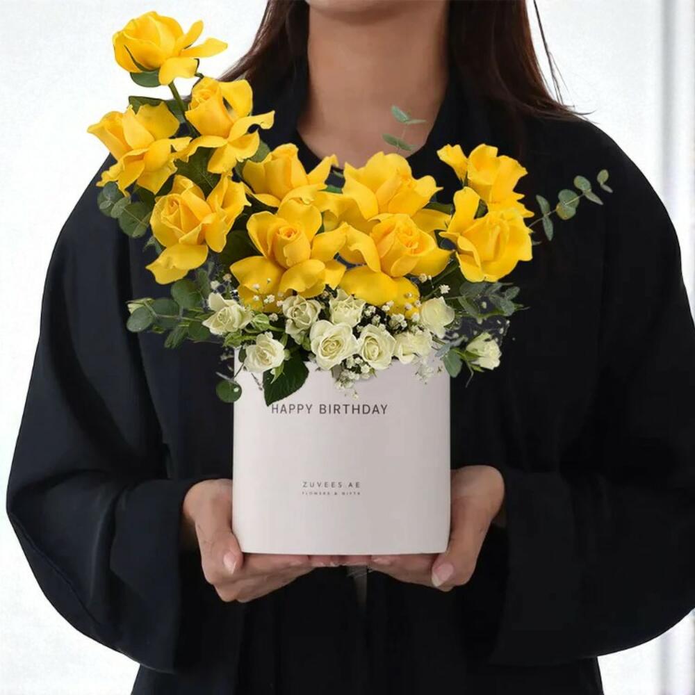 Celebrate joy and affection with the Sunshine Snowflakes Birthday Bloom Box, a radiant floral arrangement that pairs the vibrant energy of yellow roses with the gentle grace of white spray roses and delicate gypsophila. Thoughtfully styled in a modern white hatbox with “Happy Birthday” detailing, this floral gift is a perfect expression of happiness, friendship, and celebration. Care Instructions Place the bloom box in a cool spot away from direct sunlight and AC drafts. Keep the floral foam moist by adding a little clean water every other day. Avoid lifting the flowers from the foam to help maintain their design and freshness longer. Handle with care and keep the box upright.