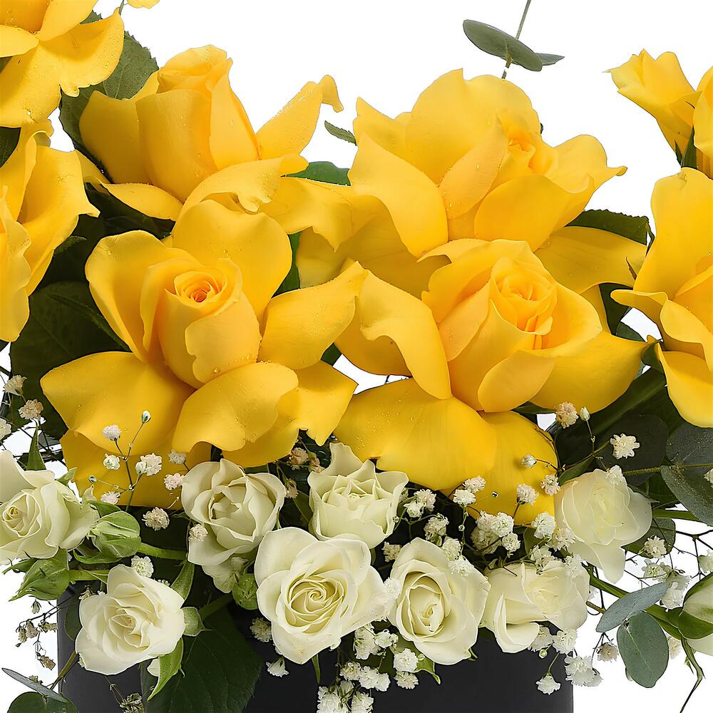 A cheerful combination of bright yellow roses, pure white spray roses, and soft gypsophila, this delightful arrangement conveys happiness, purity, and thoughtful care. ✨ Please note: The box of this arrangement can be customized in different colors upon request. Available options include: White, Desert Sand, Sand Theme, Red Theme, Black Theme, and Black.