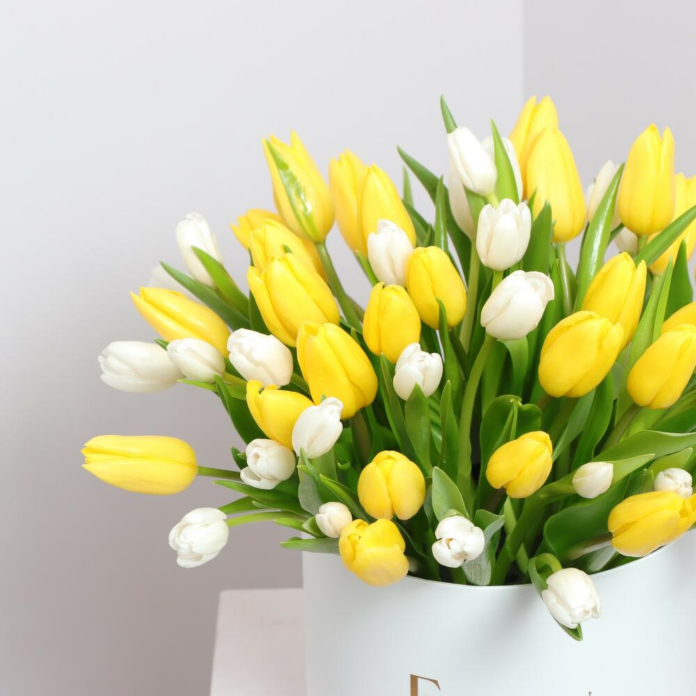 Our Sunshine Tulips will brighten up any room! The beautiful box contains white and yellow tulips sure to make a lasting impression. Get your hands on these vibrant blooms and add a delightful splash of color to your home.
