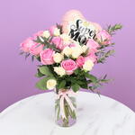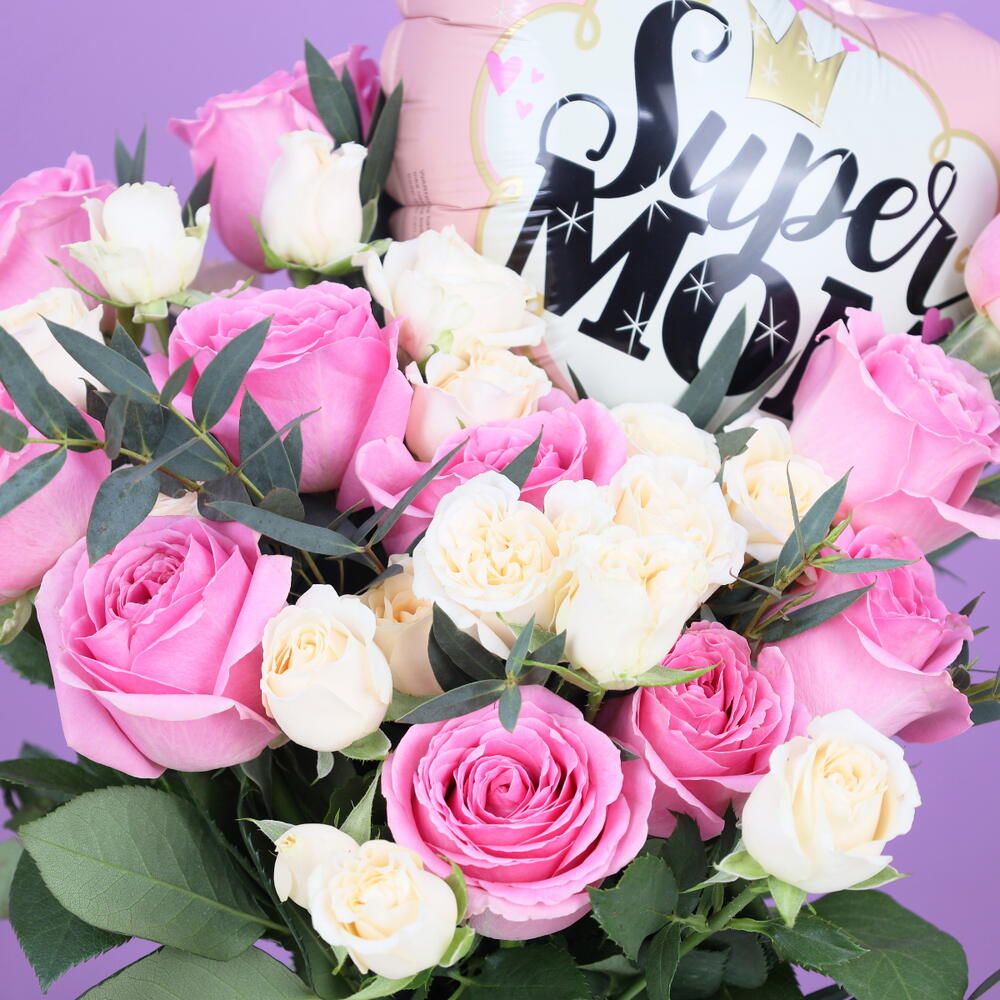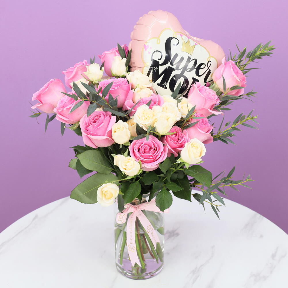 1 Super Mom Balloons 10 Inches, 12 Pink Roses, 3 Stems Peach Baby Roses, Leaves - 2 Stem Palviforia, Arranged in Cylinder Vase - 10x20cm, Tied with Pink Ribbon.