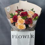 A beautiful bouquet of 5 red roses, 3 peach julieta roses, and 5 fresh ruscus greens, carefully arranged and wrapped elegantly. A charming floral gift perfect for expressing love, appreciation, or warm wishes.🌹✨