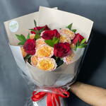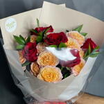 rose red - 5 pcs ruscus leaves - 5 pcs bag - 1 pcs spray rose julieta peach - 3 pcs