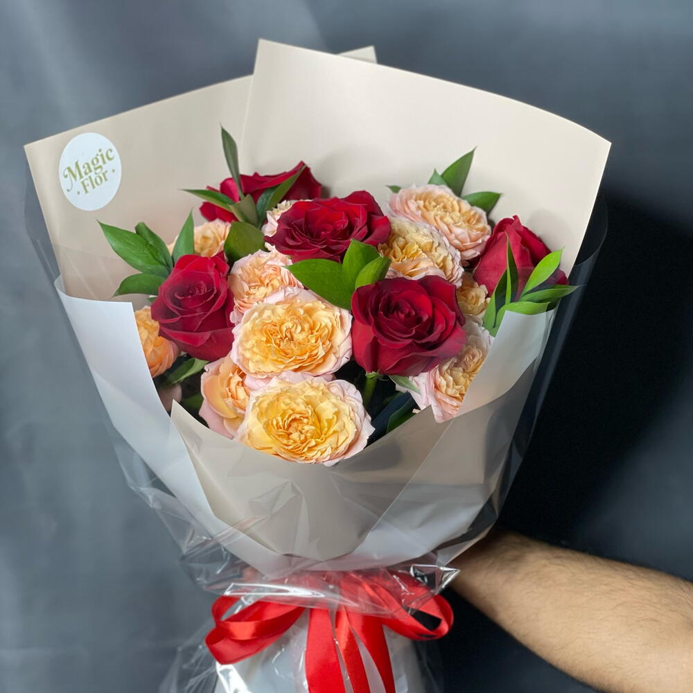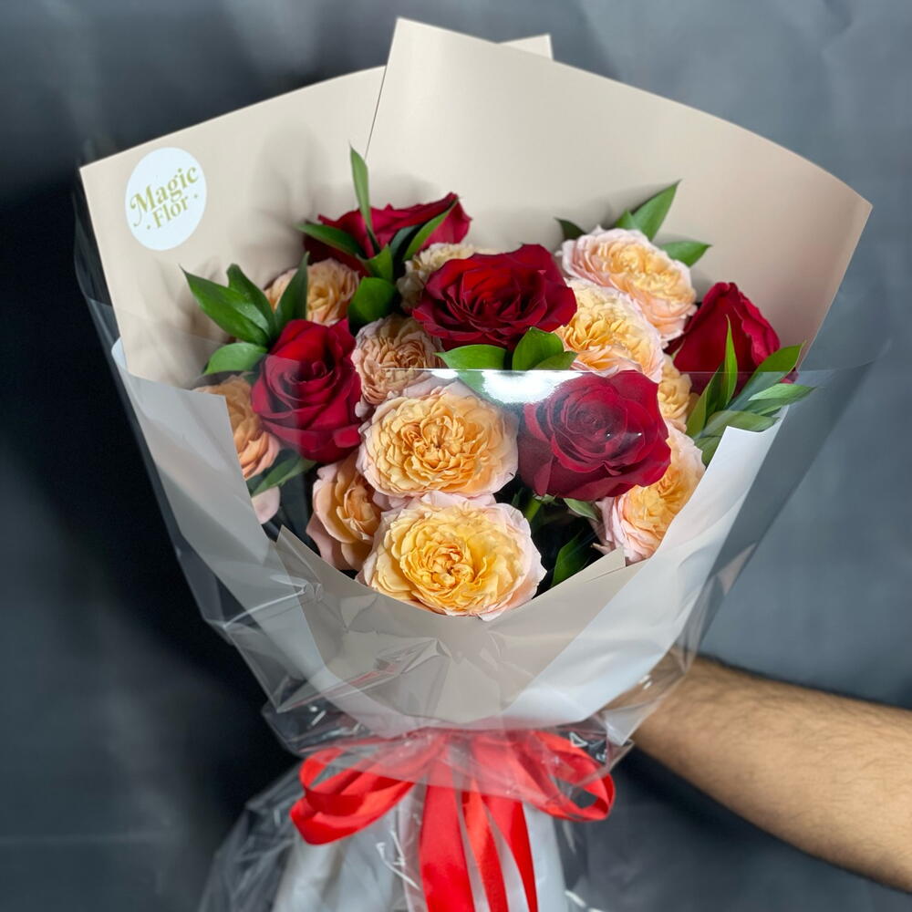 rose red - 5 pcs ruscus leaves - 5 pcs bag - 1 pcs spray rose julieta peach - 3 pcs