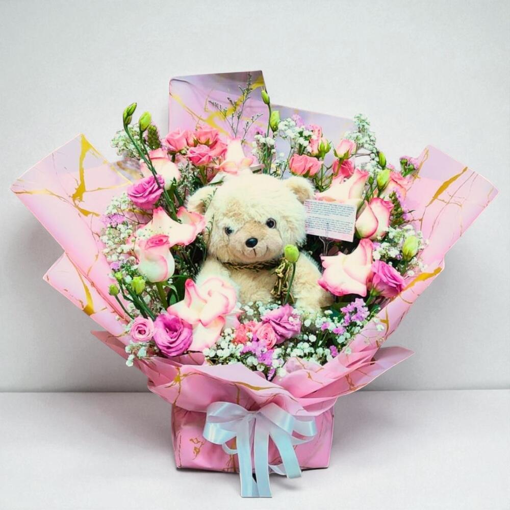 Sweet Embrace is a heartwarming bouquet crafted to express tenderness, love, and joy. This enchanting arrangement features a soft teddy bear (1 pc) nestled among 10 elegant Jumilia roses, 3 stems of delicate pink baby roses, and 4 stems of romantic pink lisianthus, accented with 2 blocks of fresh green oasis foam for lasting freshness. The flowers are beautifully presented in 6 sheets of premium pink wrapping tied with a satin ribbon, creating the perfect harmony of charm and sweetness. A bouquet that melts hearts, Sweet Embrace is more than just flowers—it’s a warm hug in a gift. The lush pink tones of roses and lisianthus radiate love and softness, while the adorable teddy bear makes it perfect for birthdays, anniversaries, baby showers, or simply showing affection to someone special. Care Instructions: Keep the bouquet in a cool environment away from direct sunlight and drafts. Ensure the oasis foam remains slightly moist by adding a small amount of clean water every two days to prolong the freshness of the flowers.