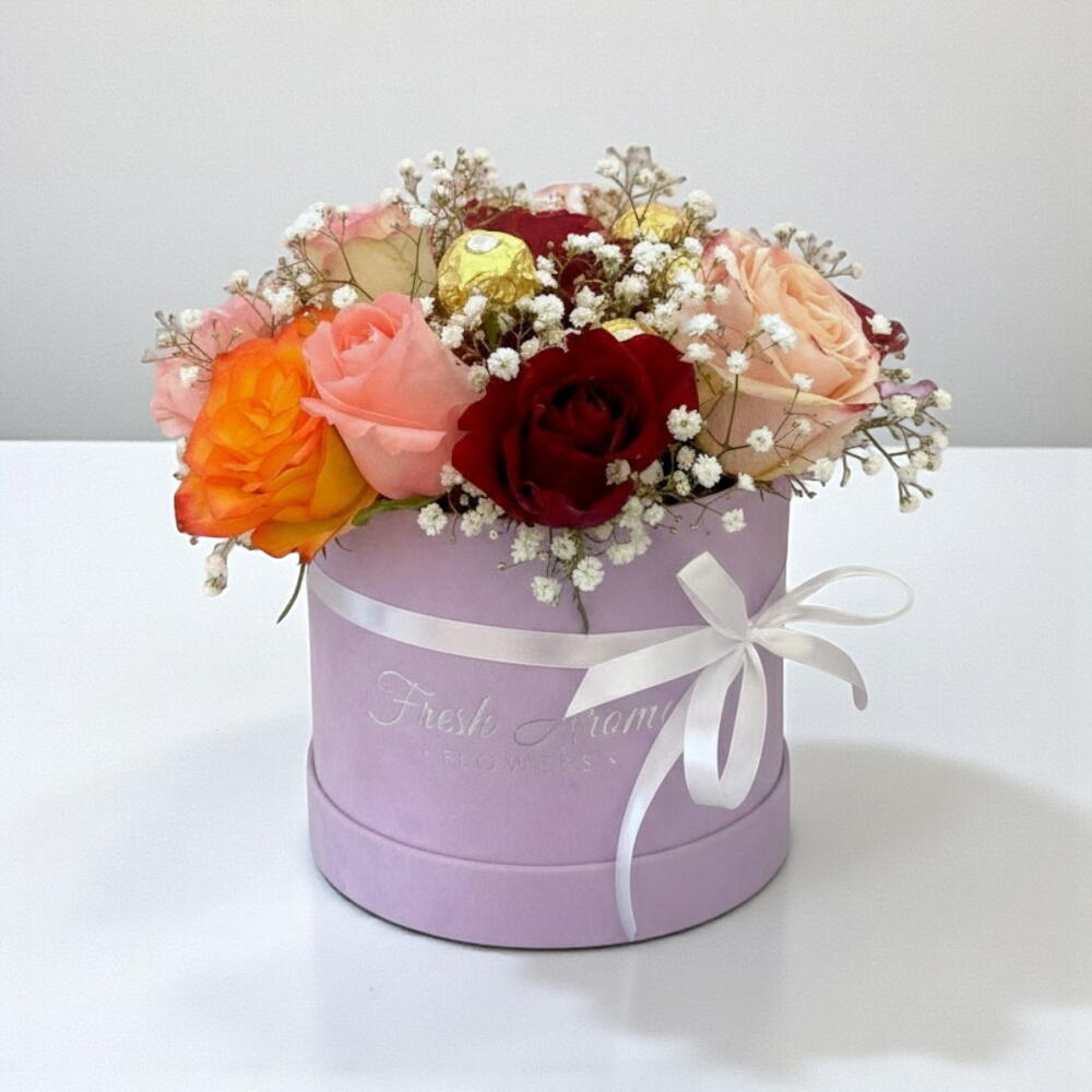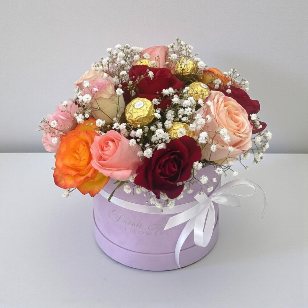 An enchanting blend of delicate roses, golden chocolates, and airy baby’s breath, this luxurious floral box is designed to express love, warmth, and appreciation. Featuring a mix of soft pink, deep red, and vibrant orange roses, the arrangement is beautifully complemented by Ferrero Rocher chocolates, adding a touch of indulgence. Presented in an elegant lilac gift box with a satin ribbon, this floral masterpiece is perfect for birthdays, anniversaries, or any heartfelt occasion. Keep the arrangement in a cool, dry place, away from direct sunlight and heat. Do not refrigerate the chocolates. Lightly mist the flowers daily to maintain freshness. If the arrangement contains floral foam, add a small amount of water every two days to keep the flowers hydrated.