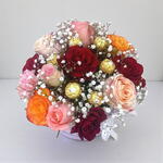 Gypsophila - 1 pcs carnation - 4 pcs orange rose - 2 pcs ferrero rochers - 6 pcs rose revival - 4 pcs rose jumilia - 2 pcs red roses - 4 pcs