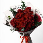 A stunning hand-tied bouquet featuring fresh red roses beautifully arranged with delicate eucalyptus greens. Wrapped in premium newspaper-style floral sheets and finished with a classic red ribbon, this bouquet blends modern elegance with timeless romance. Perfect for expressing love, admiration, and heartfelt emotions on special occasions like anniversaries, birthdays, Valentine’s Day, or romantic surprises.