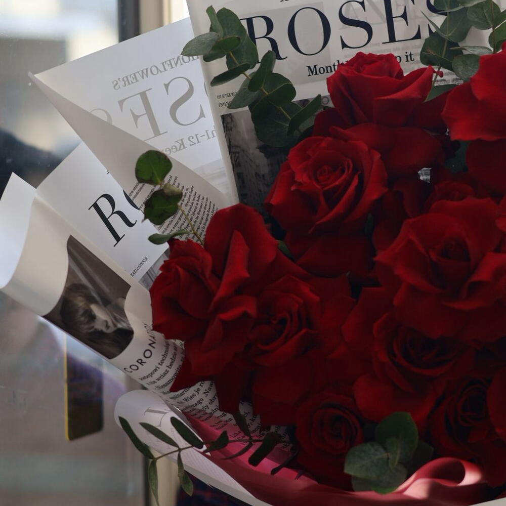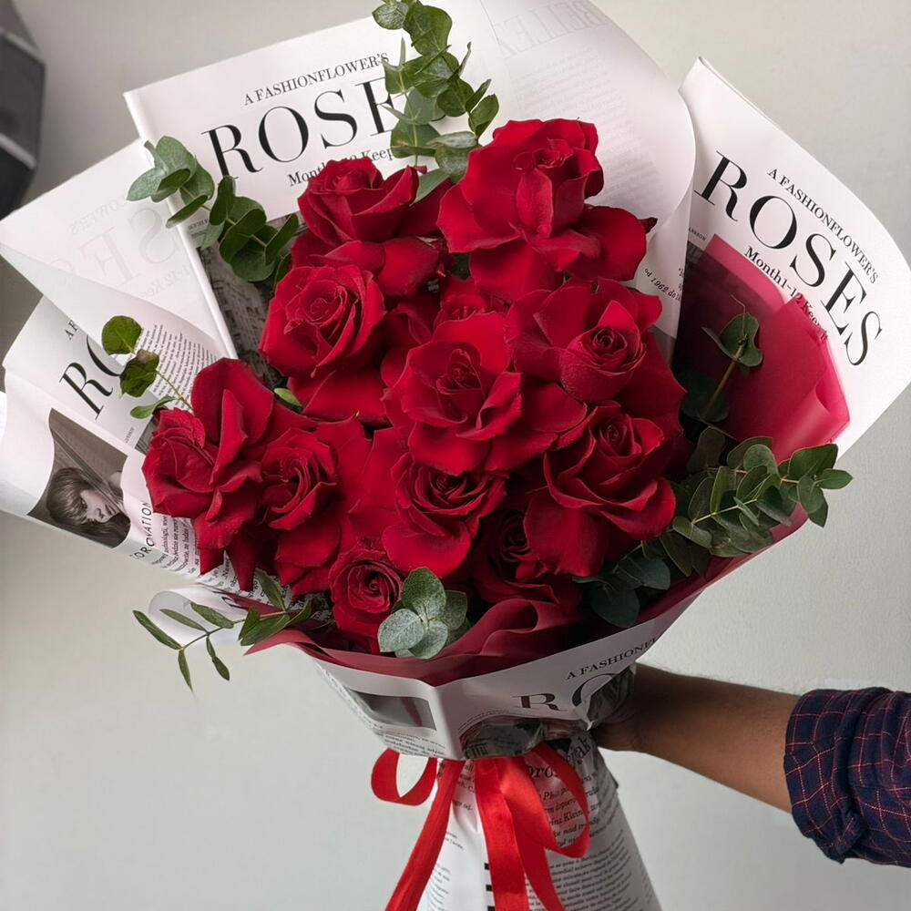A stunning hand-tied bouquet featuring fresh red roses beautifully arranged with delicate eucalyptus greens. Wrapped in premium newspaper-style floral sheets and finished with a classic red ribbon, this bouquet blends modern elegance with timeless romance. Perfect for expressing love, admiration, and heartfelt emotions on special occasions like anniversaries, birthdays, Valentine’s Day, or romantic surprises.