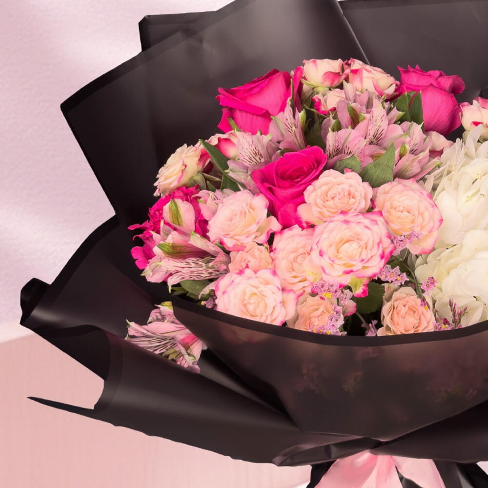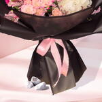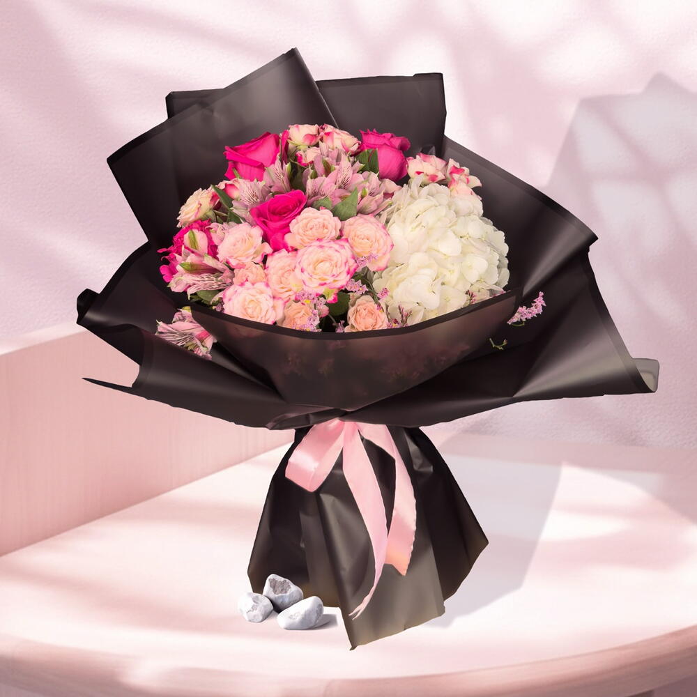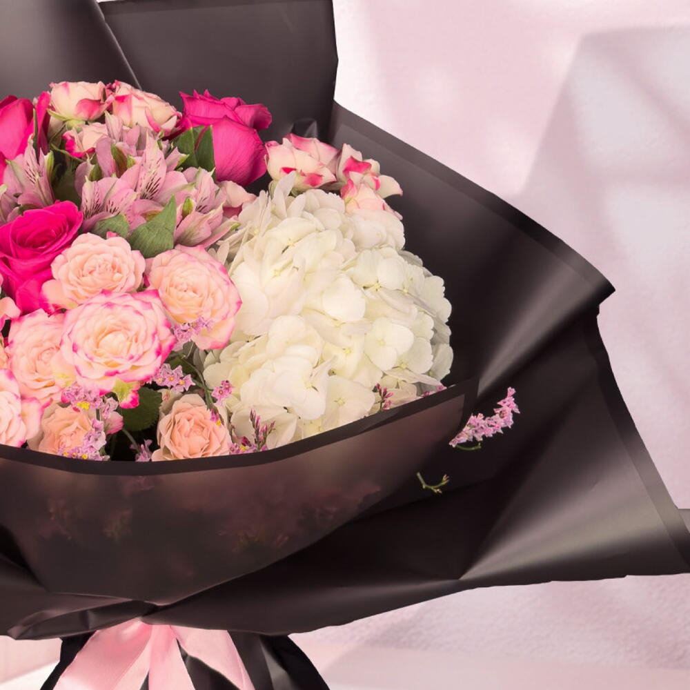 Pink rose - 4 pcs white hydrangea - 1 pcs pink limonium - 2 pcs pink astromeria - 3 pcs pink baby rose - 5 pcs