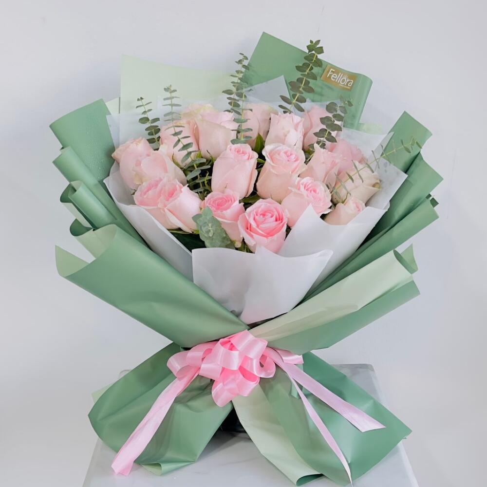 21 pink roses and green leaves in green wrapping