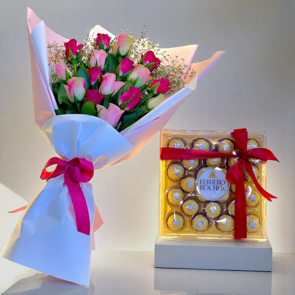 roses - 16 pcs box ferarro rochit chocolates - 1 pcs