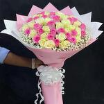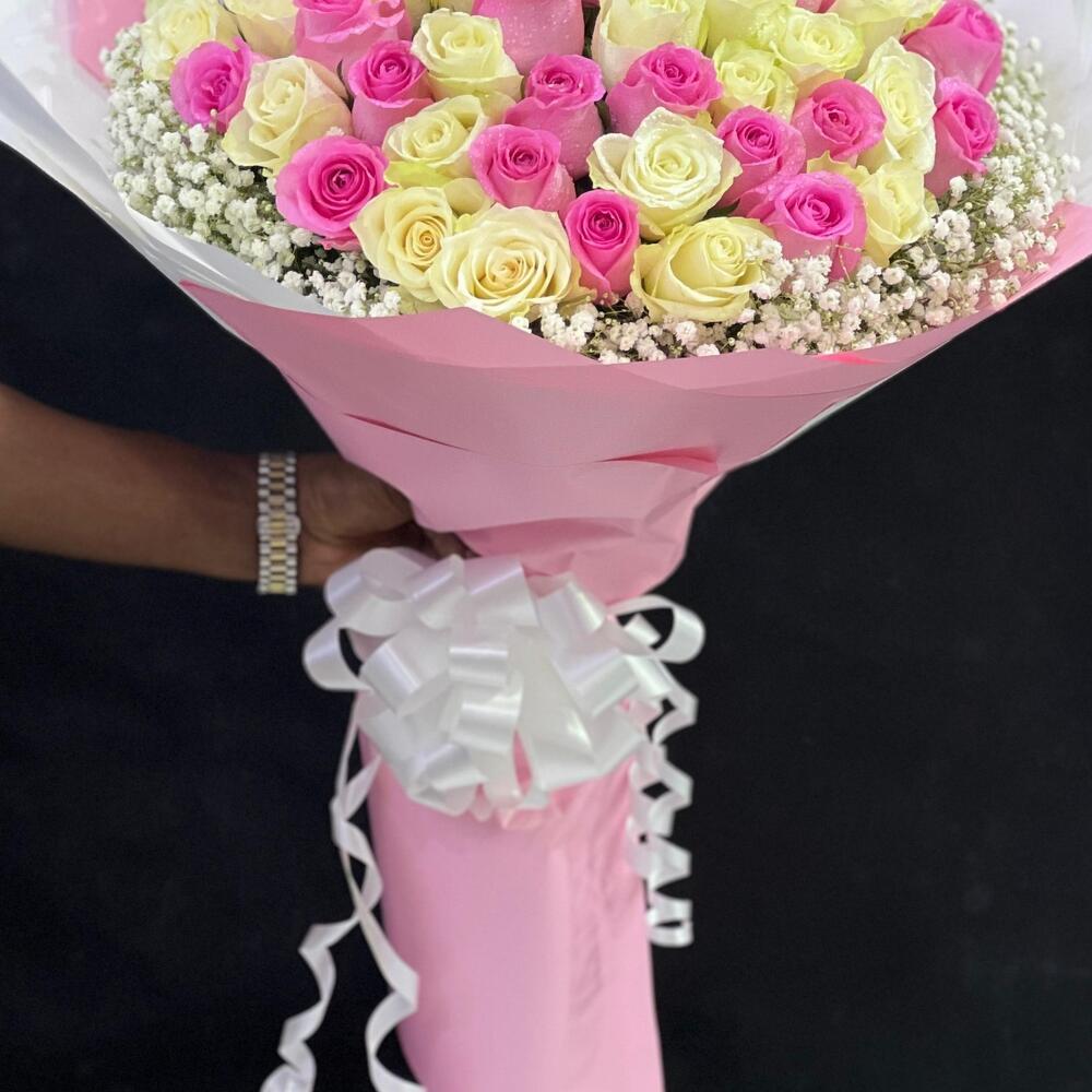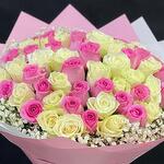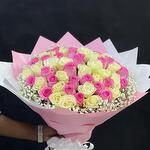 This exquisite Mono Bouquet exemplifies pure elegance with a tender arrangement of 25 luxurious pink roses, perfectly complemented by 26 snow-white roses. The bouquet is delicately enriched further with 5 sprigs of airy gypsophila, adding a touch of whimsy to its presentation. Meticulously assembled, it is gracefully wrapped in 5 sheets of high-quality wrapping paper and boldly tied together with a chic ribbon. This bouquet is the embodiment of grace and sophistication, a fitting sentiment for any occasion or sentiment.