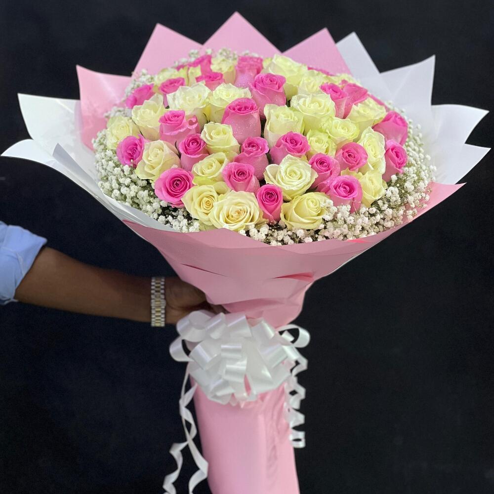 Ribbon - 1 pcs Gypsophila - 5 pcs wrapping paper - 5 pcs pink roses - 25 pcs white roses - 26 pcs