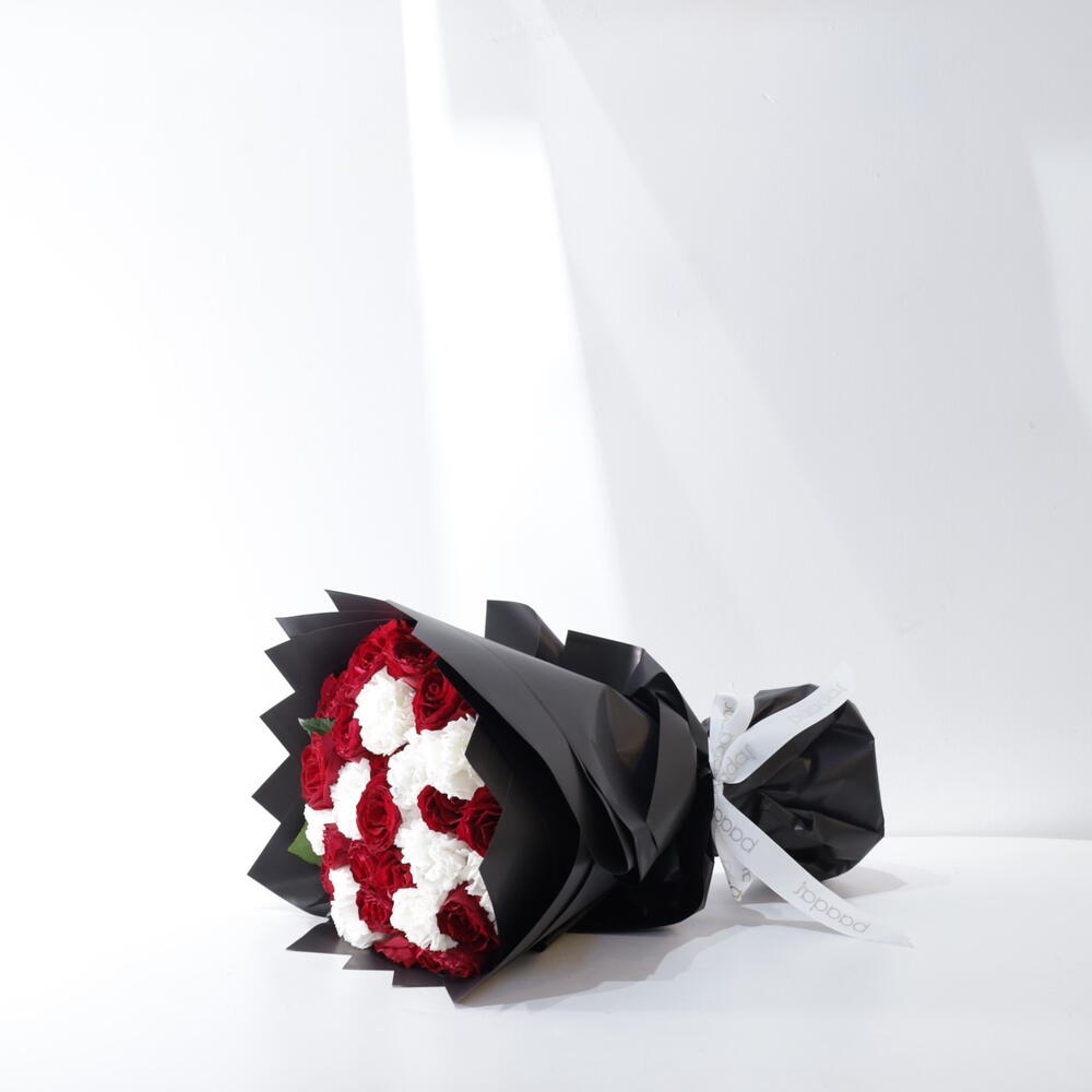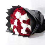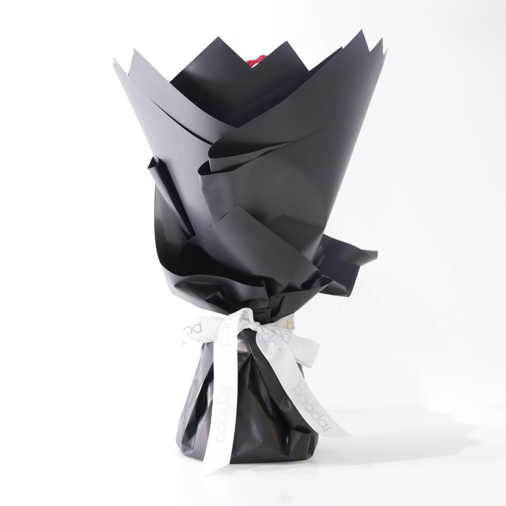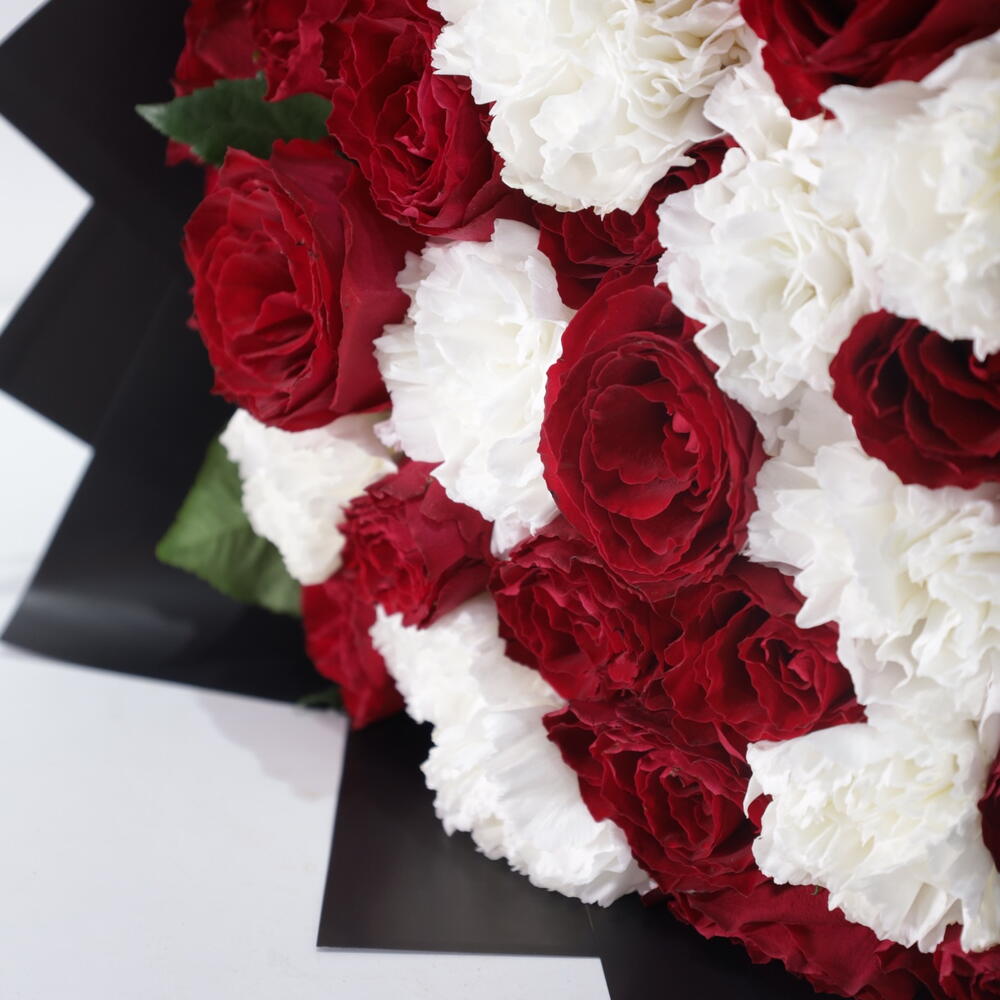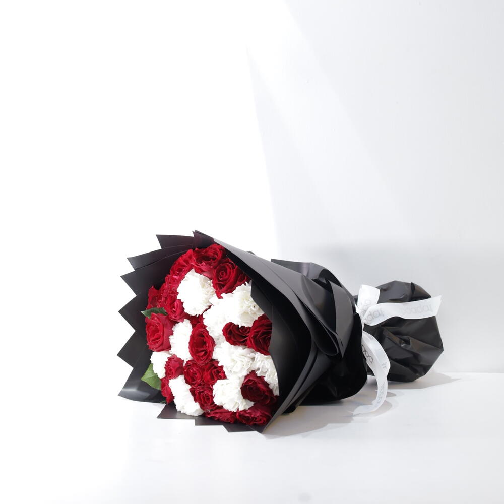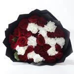 A bouquet of 20red roses white carnation wrapped in black wrapping sheet is a meaningful gift for a loved one. The roses symbolize love respect and the black wrapping adds sophistication. Bouquet Includes: White Carnations : 10 Red Roses: 20 Black Wrapping: 12 Baaqat ribbon large white -25ml: 1 Flowers Care Instructions: • Replenish the water frequently. Change the water entirely every 2-3 days. Trim at least a half inch of stem off your flowers before you put them in a vase and each time you change the water. Keep your flowers away from heat and bright light. Avoid sitting your flowers beside ripening fruit or vegetables, especially bananas and apples. Use sharp scissors when cutting. Note: Flowers can last up to 7 days if the above care instructions are followed and well maintained.