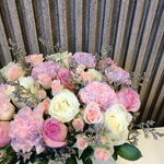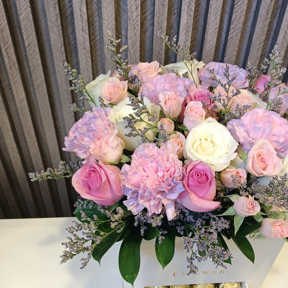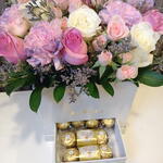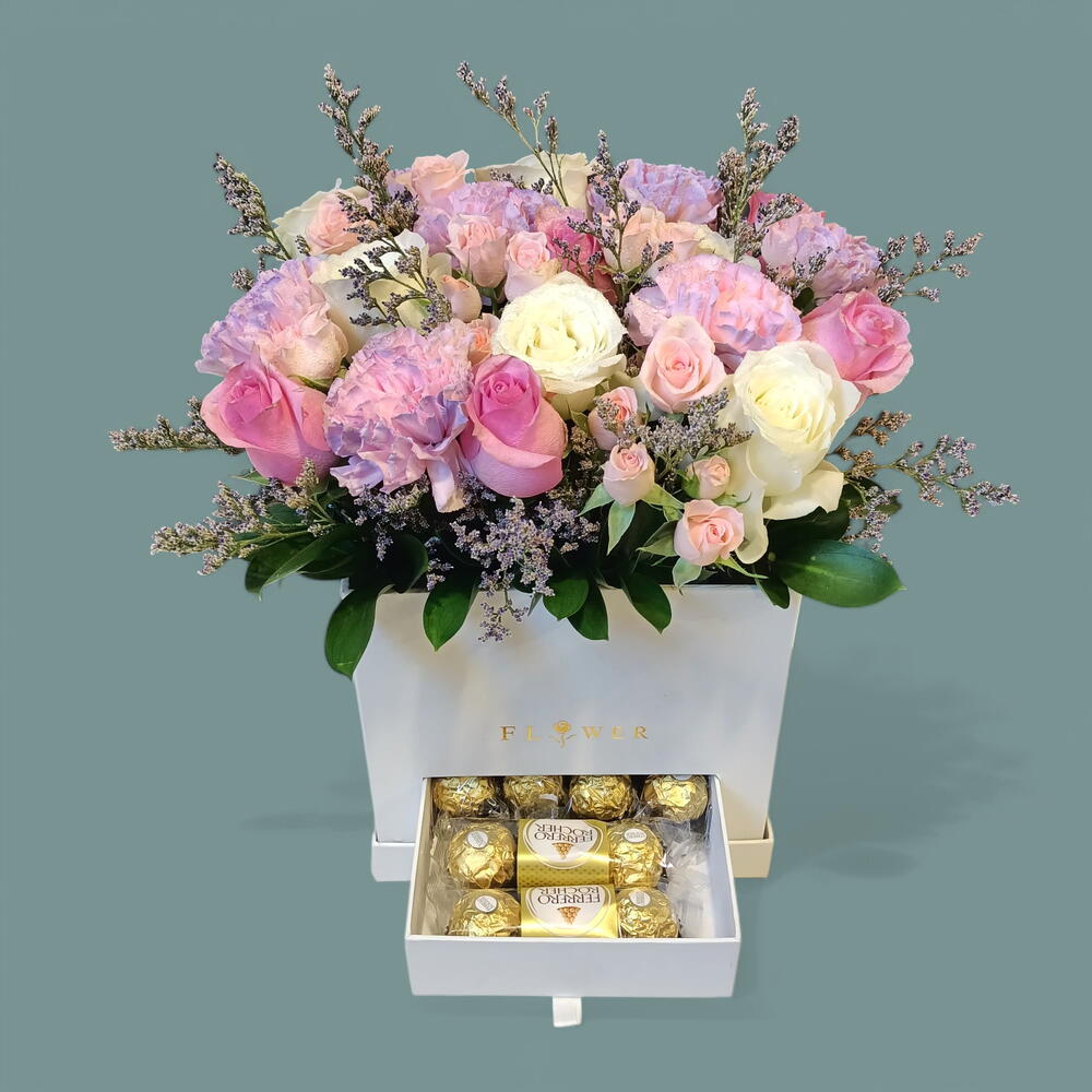 A charming arrangement of pastel roses and carnations, nestled in an elegant box with a hidden drawer of Ferrero Rocher chocolates, offering a delightful surprise.