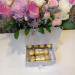carnations - 7 pcs ferrero rocher chocolates - 18 pcs roses - 10 pcs spray roses - 4 pcs limoniums - 3 pcs