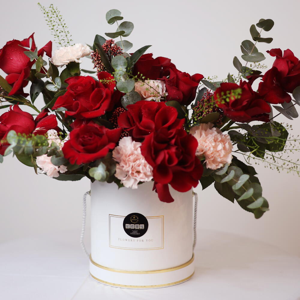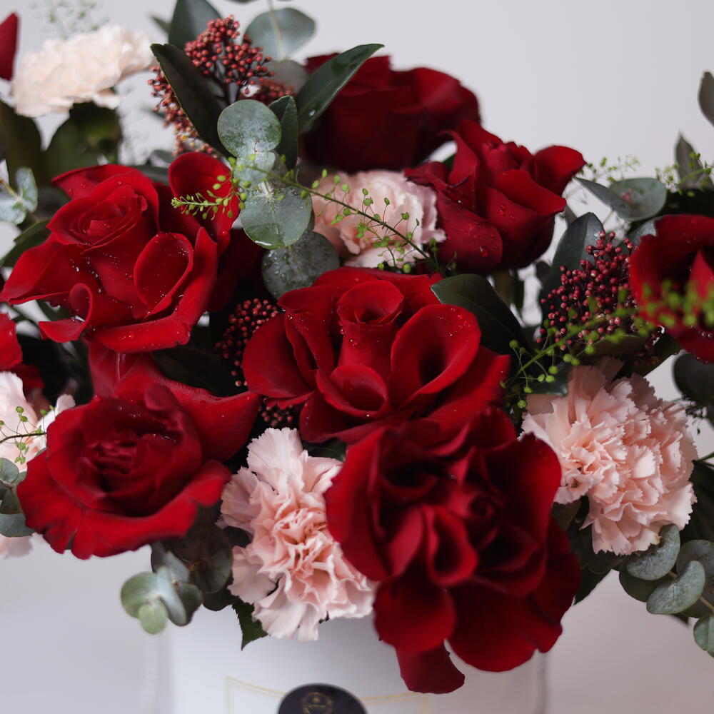 Sweet Wild Bloom Flower Bouquet – Red Roses, Pink Carnations Skimmia in White Box (Delivery in UAE)