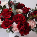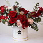 Red rose - 10 pcs carnation pink - 6 pcs white box - 1 pcs eucalyptus cinerea - 7 pcs skimmia red - 4 pcs lepidium green - 2 pcs