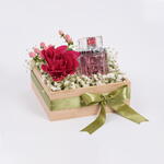 1 Square Wooden Box, 1 Dark Pink Rose, 1 Casino Pink Hypericum Coco Filler, 3 White Gypsophillia Filler, 1 Edge Intense Women By Swiss Arabian, 1 Foam Oasis Local, 2 Green Silky FNP Logo Ribbon
