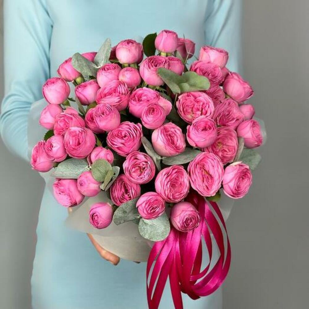 Ribbon - 1 pcs Eucalyptus - 2 pcs floral oasis - 1 pcs flower box white 15 dia - 1 pcs spray rose gisalle - 9 pcs wrapping transperent - 1 pcs
