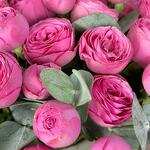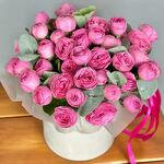 Velvet tactile hat box with Sylva Pink peony shrub roses and eucalyptus. A stylish hat arrangement to put you in the perfect mood. Perfect as a sign of attention, the recognition of fond feelings, as well as a birthday gift for a girl, girlfriend, mother, grandmother, sister. We recommend adding a little water at the base of the flowers every day to keep the oasis moist.