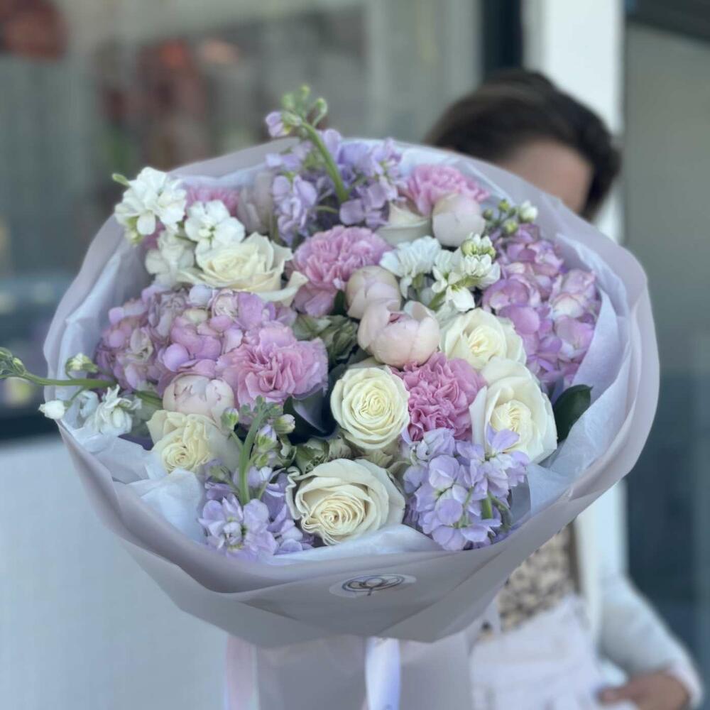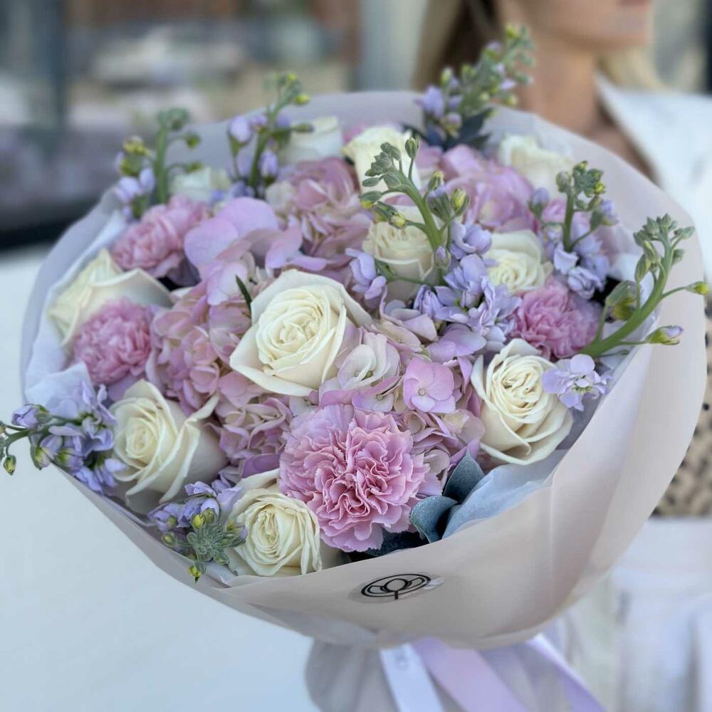 pink carnations - 6 pcs pink hydrangea - 4 pcs white roses - 15 pcs lilac matthiola - 8 pcs
