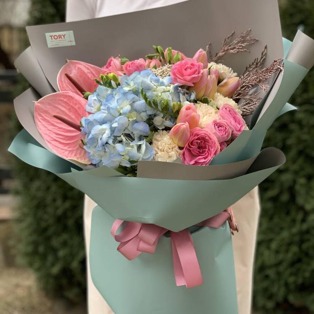 Composition: Tulip - 7, Hydrangea - 1, Anthurium - 2, Dianthus - 5, Pistacia - 3, Freesia - 3, Ozothamnus - 1, Thuja dyed - 1, Spray Rose Bellalinda Kiss light pink - 3, wrapping - 6, ribbon - 1 Sizes: WIDTH - 50CM; HEIGHT - 65CM; LENGTH - 65CM; (including packaging) Size: 50 x 65 x 65 cm