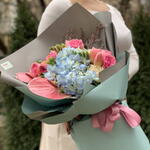 Ribbon - 1 pcs Hydrangea - 1 pcs Freesia - 3 pcs Pistacia - 3 pcs Anthurium - 2 pcs Wrapping - 6 pcs Tulip - 7 pcs dianthus - 5 pcs ozothamnus - 1 pcs thuja dyed - 1 pcs spray rose bellalinda kiss light pink - 3 pcs