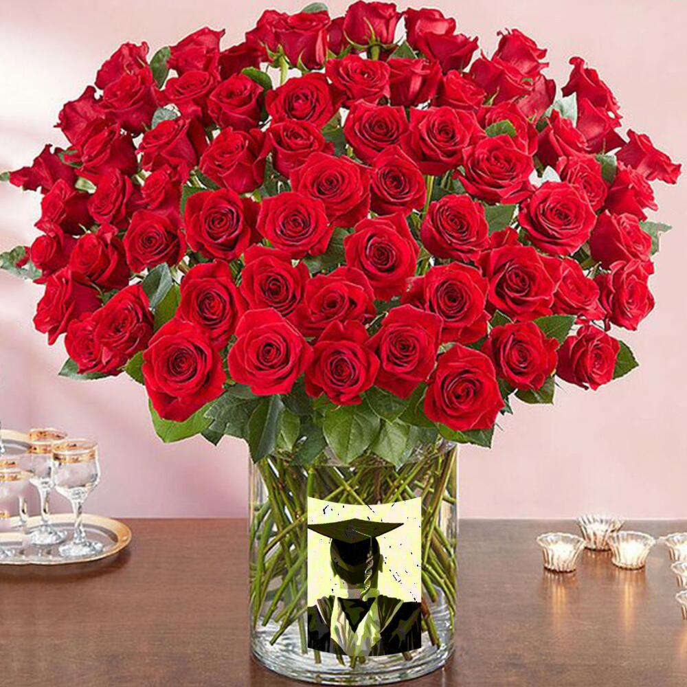 "Product Details: 100 Red Roses Fillers- Salal Tips Glass Vase - 30X15Cms"