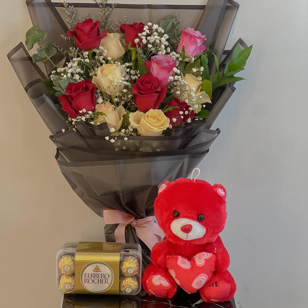 Red rose - 5 pcs Ferrero rocher - 16 pcs Gypsophila - 3 pcs purple rose - 2 pcs peach rose - 5 pcs green leaf - 3 pcs teddu bear red - 1 pcs