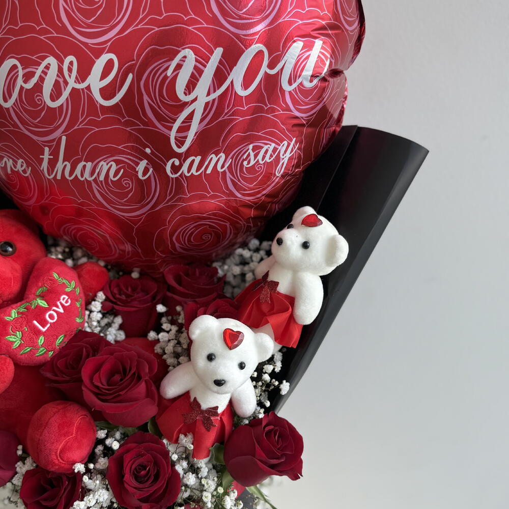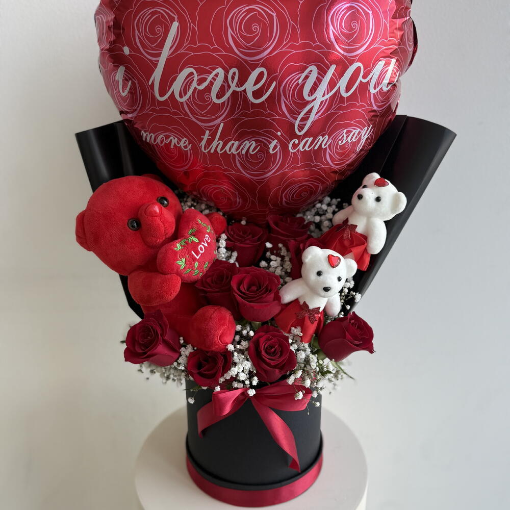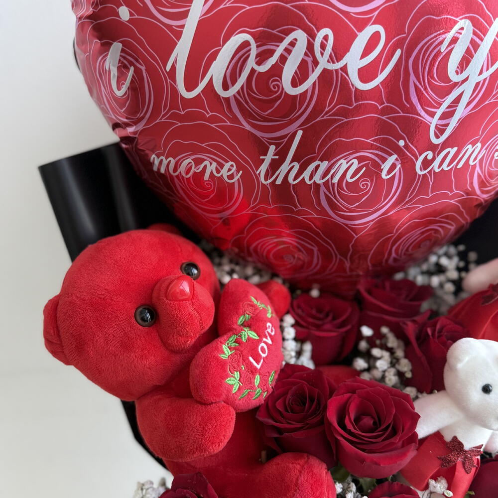 Make hearts melt instantly with Teddy Love — a sweet and romantic red rose bouquet gift set made for pure love and surprise. This adorable fresh flowers bouquet features deep red roses (classic roses) nestled with delicate gypsophila (baby’s breath) and lush greenery, beautifully styled in premium black wrapping and finished with a satin ribbon. Topped with a giant heart balloon and cute teddy accents, it’s a truly unique flowers bouquet that delivers maximum “wow” the moment it arrives. Perfect as birthday flowers and flowers for birthday, Teddy Love is also a top pick for anniversaries, proposals, Valentine’s Day, and any moment that calls for love and romance flowers. If you’re searching for the best flowers for anniversary, a memorable birthday gift, or a stunning romantic bouquet in Dubai, this premium flowers bouquet made with premium quality flowers is guaranteed to say “I love you” louder than words.