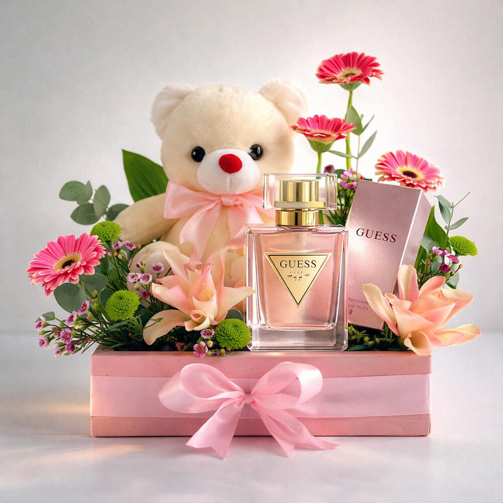 A refined women’s gift featuring an original Guess Eau de Parfum (75ml), soft pink floral arrangement, and a plush teddy bear—beautifully styled in a keepsake box. Designed for Valentine’s Day, birthdays, and moments that deserve something truly special. This charming set features a cute teddy bear, symbolizing comfort and affection, paired with 4 vibrant pink gerberas and 2 delicate pink roses arranged with soft fillers for a fresh, graceful look. The highlight of the hamper is the Guess Pink Eau de Parfum (75ML) — a chic, feminine fragrance loved for its floral sweetness and modern elegance. ✓ Guess Pink Eau de Parfum – 75ML ✓ Teddy bear – soft cuddly ✓ 4 pink gerberas + 2 pink roses with fillers ✓ Stylish wooden gift box ✓ Perfect for birthdays, anniversaries, romantic surprises special occasions ✓ Same-day delivery across Dubai JVC “Surprise her with elegance — order this Guess Pink Gift Hamper today!” “A fragrance, flowers love in one box — shop this luxury hamper now!” “Make her feel truly special — send this beautiful wooden gift set today!”