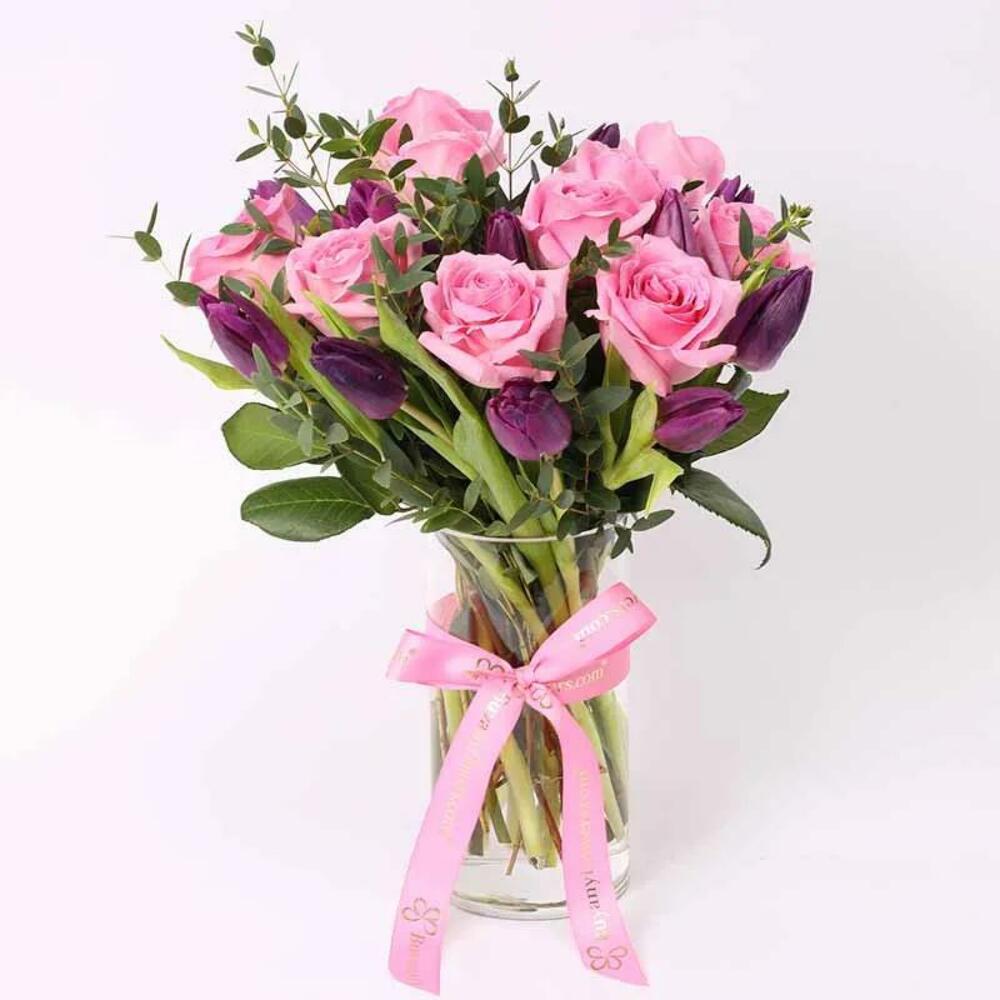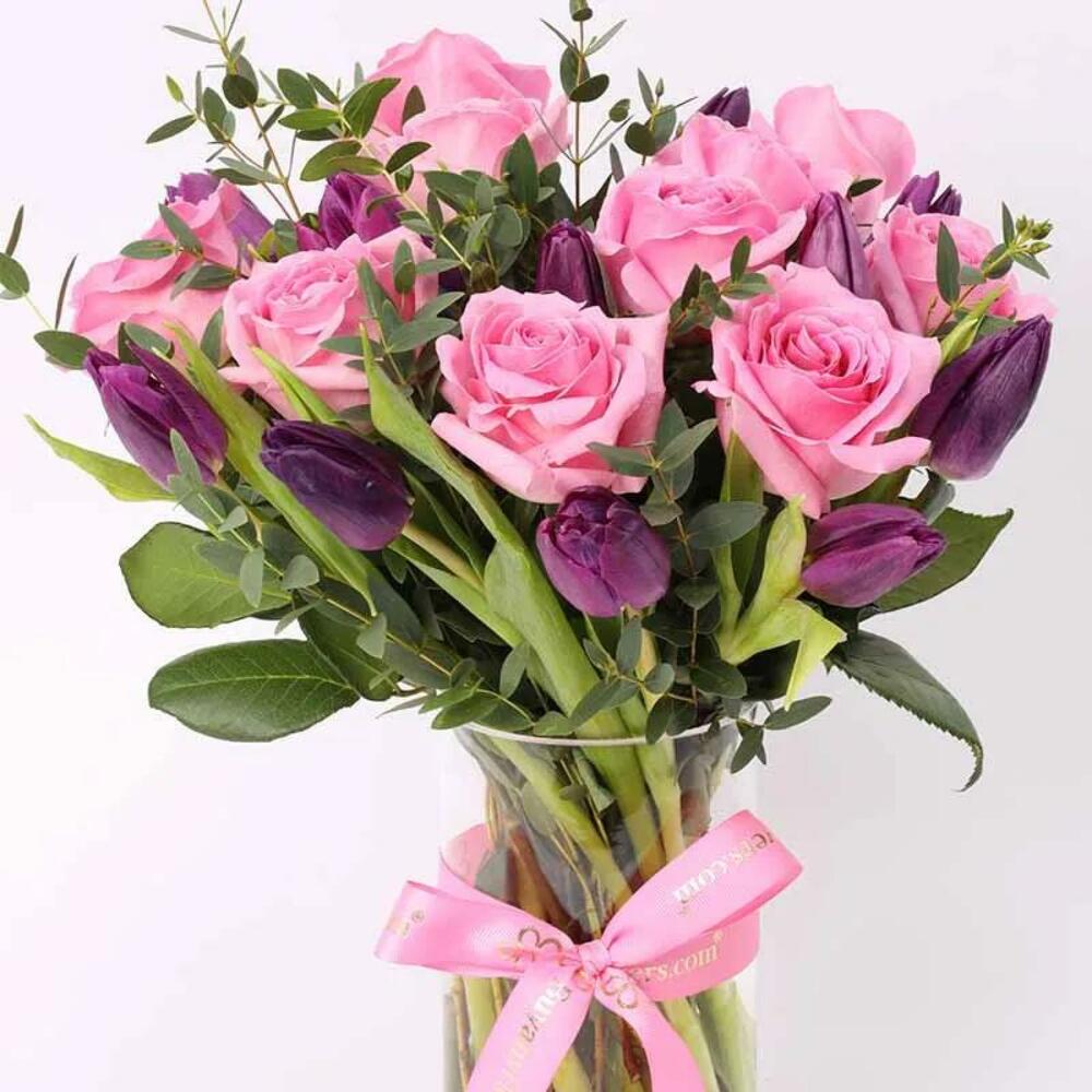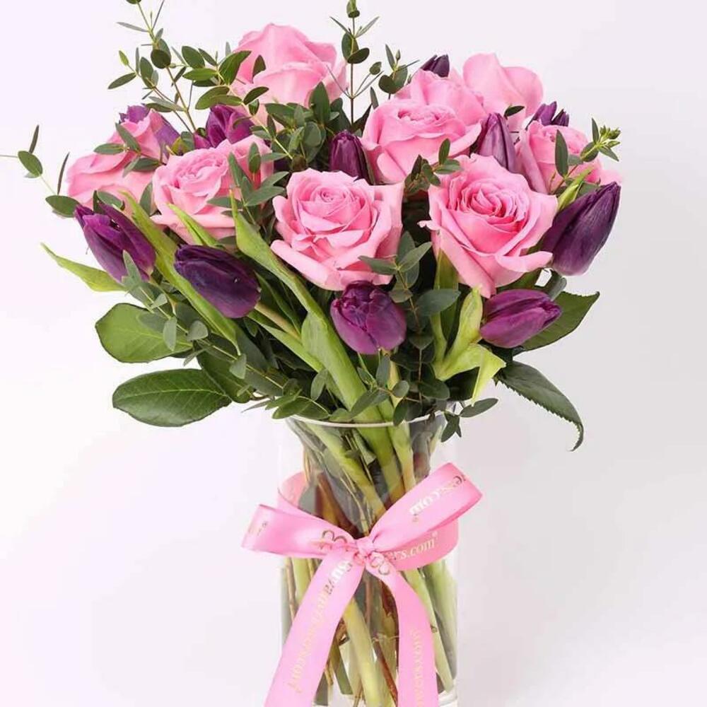 11 Pink Roses 10 Purple Tulips Palviforia Leaves Prepared in Glass Vase and a Ribbon Bow