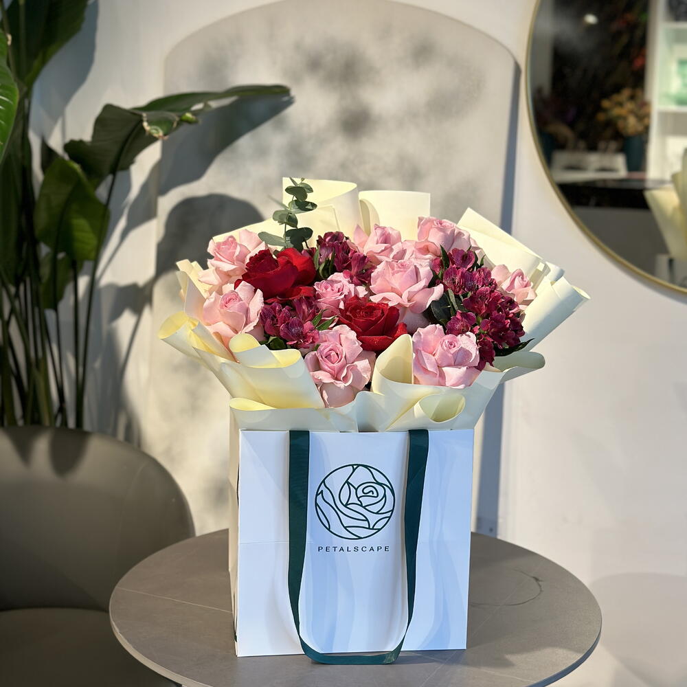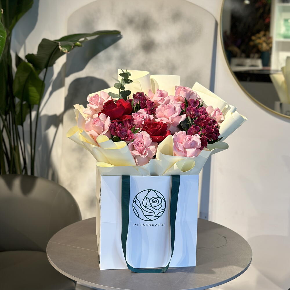 Experience the charm of this seamless blend of roses and alstromeria, meticulously handpicked by experienced florists. Seven stunning roses join their allure with seven irresistible alstromerias, culminating in a bouquet of unmatched elegance and beauty. This floral composition manifests classic charm and contemporary aesthetics nestled together to ignite love and beauty in every heart. A perfect expression of adoration, this amalgamation of flora breathes life into every cherished moment.