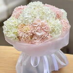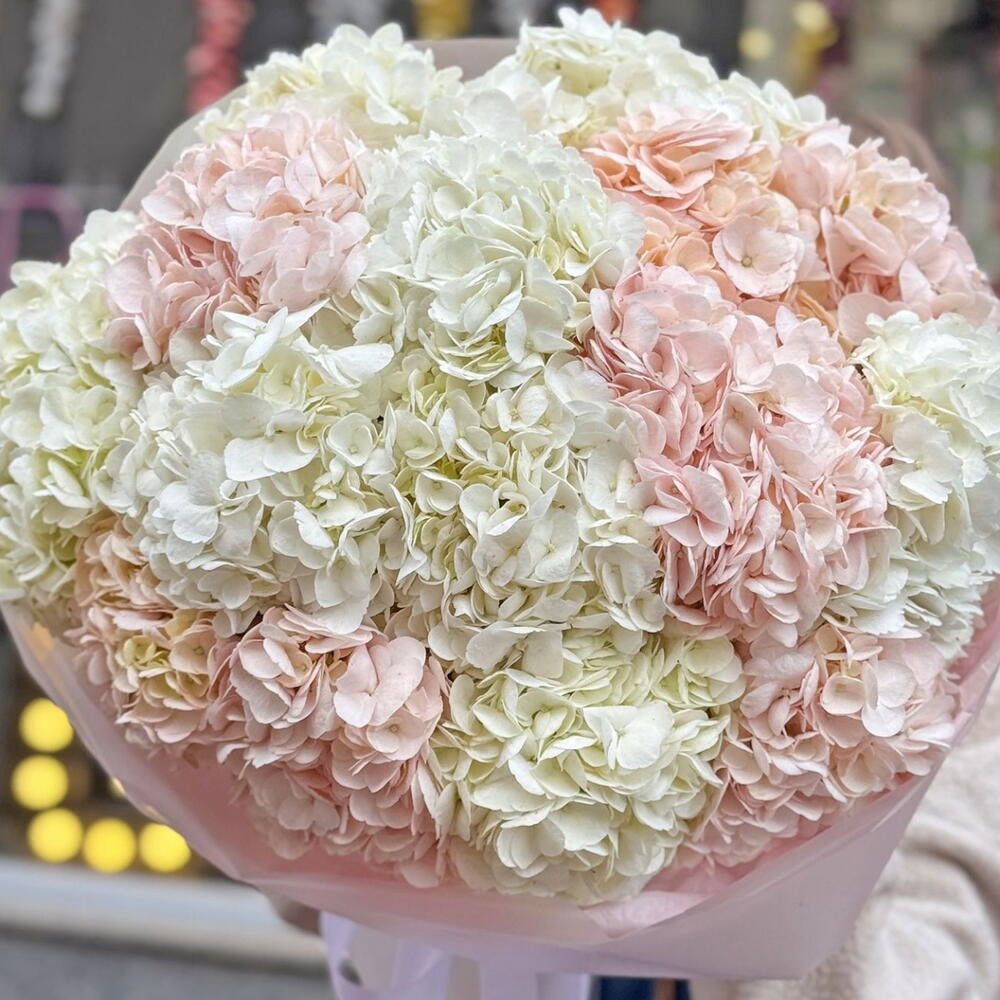 This charming bouquet is a real cloud of tenderness, made up of lush inflorescences of white hydrangeas. Each flower resembles a light fluffy cloud, filling the space with freshness and lightness. Delicate petals create a voluminous, airy composition, which is ideal for romantic moments, wedding celebrations or just to give a smile to a loved one. Complement the gift with an open card with wishes - and your emotions will be unforgettable