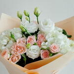 Spray rose - 5 pcs hydrangea white - 2 pcs lisianthus white - 3 pcs cinerea eucalyptus - 2 pcs premium wrapping - 4 pcs