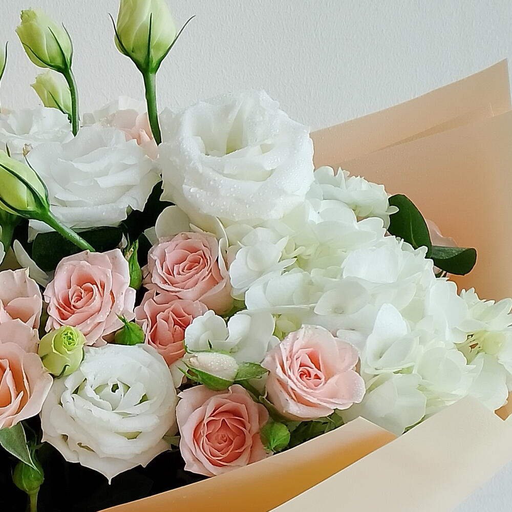 Soft, elegant, and effortlessly luxurious—this premium Pastel Color bouquet is a dreamy Mixed flowers bouquet / Mixed flower bouquet in creamy whites and blush tones. It features fluffy white hydrangea, delicate white lisianthus (eustoma) with fresh buds, and romantic peach/pink roses (including spray roses) for a sweet Rose bouquet touch. Wrapped in warm nude-beige paper and finished with a ribbon, it’s a Fresh flowers bouquet (Fresh bouquet) made with premium quality and premium quality flowers—clean, classy, and photo-ready (flower mix may vary slightly by season while keeping the same look and feel). Perfect as a beautiful Birthday Bouquet and a strong choice for the best birthday bouquet—ideal for Birthday flowers, Flowers for birthday, and thoughtful Birthday gifts. It also works wonderfully as a Congratulations bouquet with elegant Congratulations flowers, and it’s one of the best flowers for anniversary when you want something romantic yet refined. A stylish cool bouquet, always a trending bouquet and a truly unique flowers bouquet—perfect for anyone searching for the best bouquet in dubai.