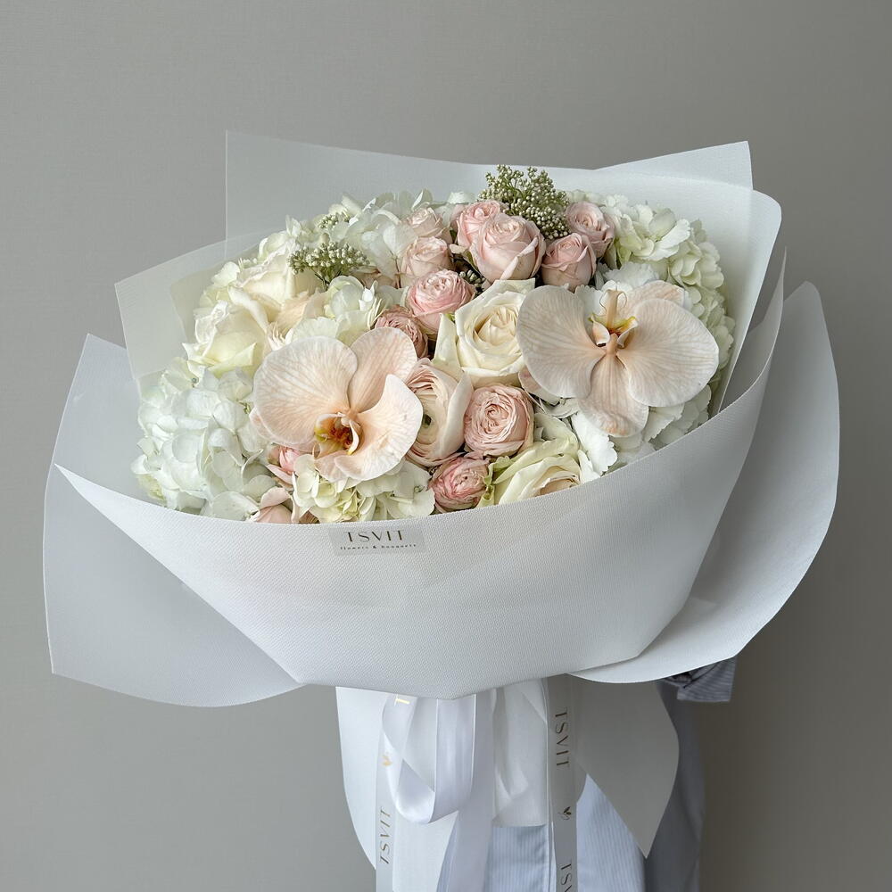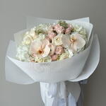 Hydrangea - 7 pcs carnation - 2 pcs ranunculus - 7 pcs bombastic rose - 4 pcs ozothamnus - 4 pcs ohara rose - 5 pcs Phalaenopsis orchid - 8 pcs