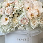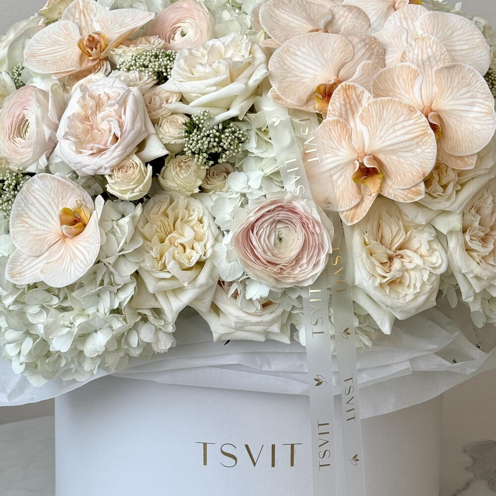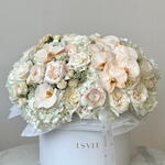 carnation - 8 pcs ranunculus - 5 pcs hydrangea white - 30 pcs bombastic rose - 12 pcs ozothamnus - 7 pcs ohara rose - 10 pcs Phalaenopsis orchid - 8 pcs