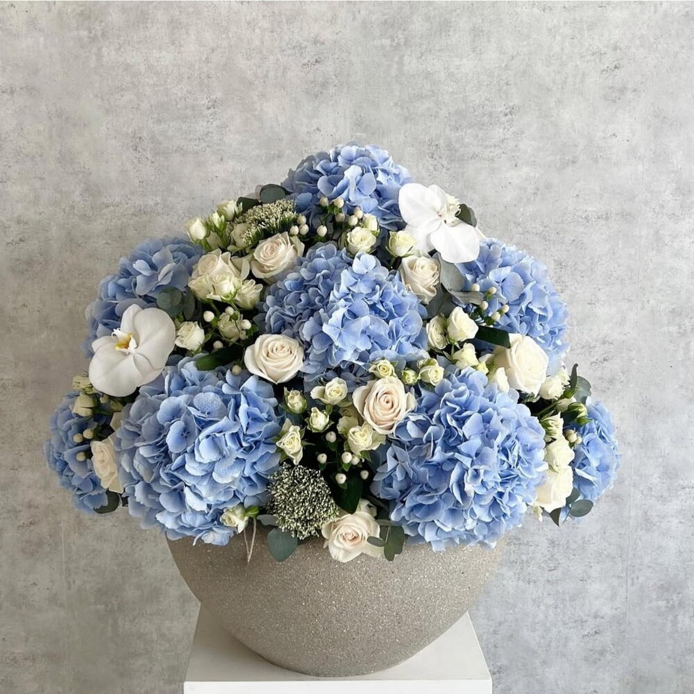 Experience the epitome of luxury with Ashford Manor — a grand, sophisticated bouquet featuring 10 serene blue hydrangeas, 10 elegant white orchids, 20 pristine white roses, 50 delicate white spray roses, 5 fluffy gypsophila, and 10 subtle cherry accents. Hand-arranged in a large vase, this opulent floral ensemble radiates timeless elegance, making it perfect for high-end interiors, weddings, or gifting a statement of refined taste. Each bloom is carefully selected for freshness, fullness, and harmony, creating a voluminous, cloudlike display that exudes sophistication. The combination of crisp whites, soft blues, and gentle cherry highlights provides depth, texture, and visual delight — a centerpiece that elevates any space with classic manor-inspired charm.