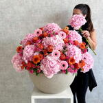 Make a bold statement with Belmont Manor — a vibrant and luxurious bouquet featuring 15 soft pink hydrangeas, 30 vivid orange roses, 30 delicate pink spray roses, and cheerful daisies in shades of pink and orange (10 each). Hand-arranged in a large vase, this colorful ensemble blends elegance, energy, and playful charm, perfect for interior décor, special occasions, or gifting someone unforgettable. Every bloom is carefully selected for freshness and fullness, creating a lush, voluminous arrangement that bursts with color and life. The harmonious mix of pastel pinks and bold oranges adds depth and personality, making Belmont Manor a centerpiece that commands attention while exuding sophistication.