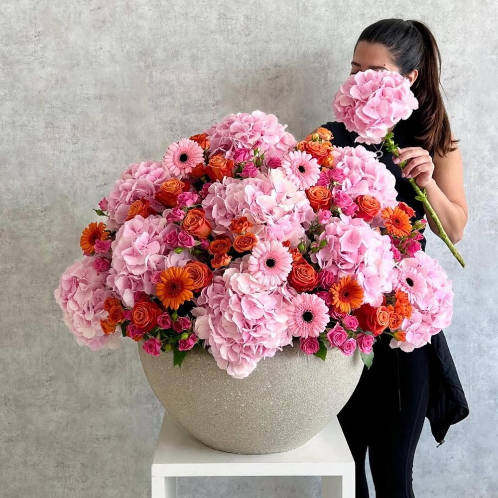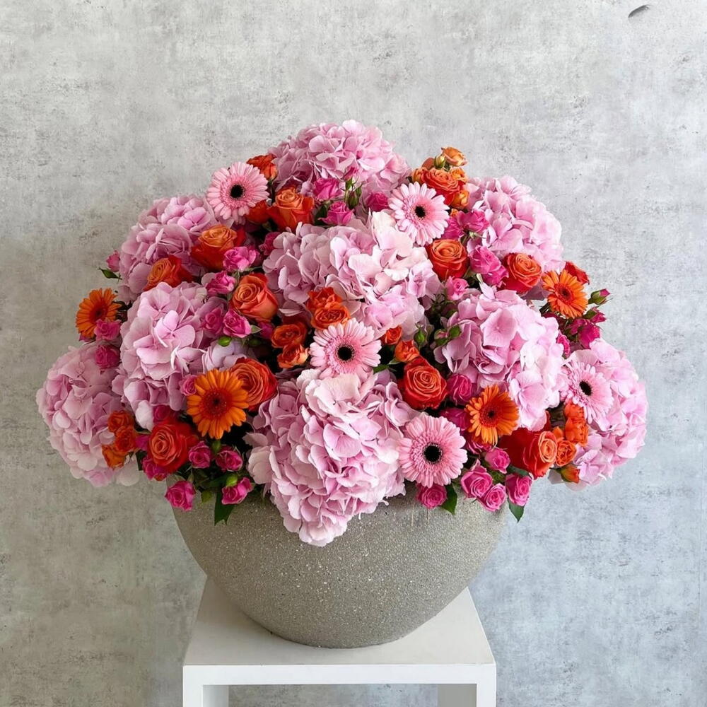 Make a bold statement with Belmont Manor — a vibrant and luxurious bouquet featuring 15 soft pink hydrangeas, 30 vivid orange roses, 30 delicate pink spray roses, and cheerful daisies in shades of pink and orange (10 each). Hand-arranged in a large vase, this colorful ensemble blends elegance, energy, and playful charm, perfect for interior décor, special occasions, or gifting someone unforgettable. Every bloom is carefully selected for freshness and fullness, creating a lush, voluminous arrangement that bursts with color and life. The harmonious mix of pastel pinks and bold oranges adds depth and personality, making Belmont Manor a centerpiece that commands attention while exuding sophistication.